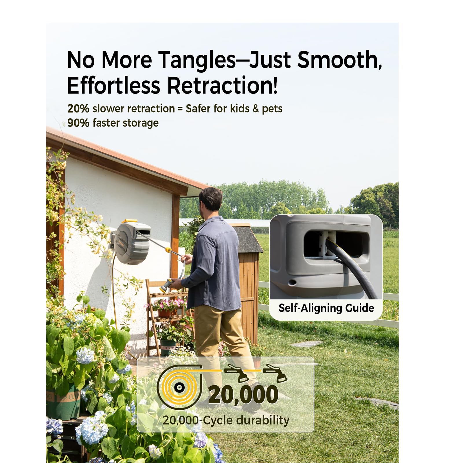 • 20,000-Cycle Self-Winding System: Industrial-grade alloy spring ensures consistent retraction force. The self-winding hose reel retracts 20% slower to prevent whipping hazards while achieving 90% faster storage with smooth, tangle-free operation