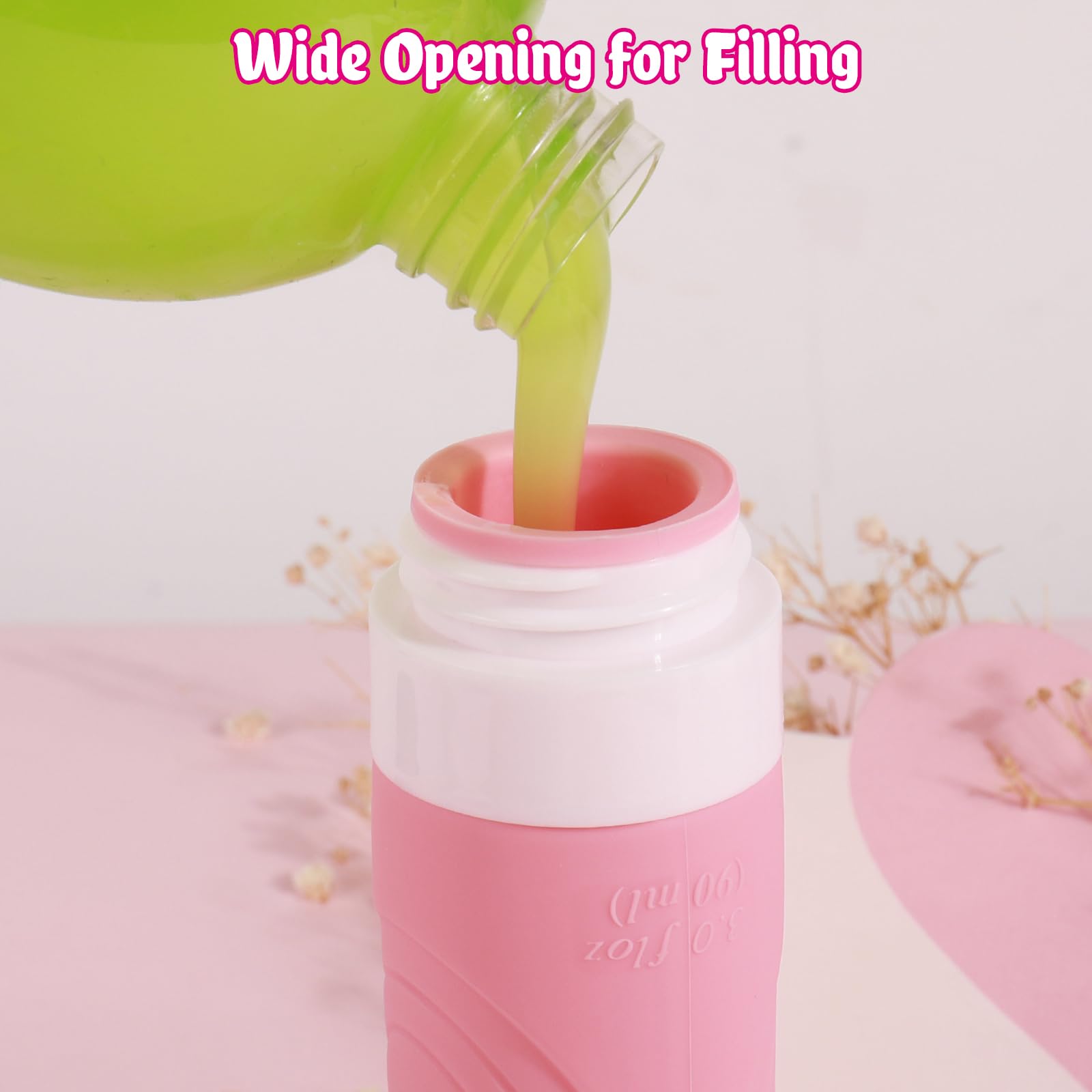GLAMFIELDS TSA Approved Travel Bottles for Toiletries, 3oz Size Leak Proof Silicone Containers for Shampoo, Conditioner,Easy to Squeeze and Portable, Essentials for Traveling (4 Pack) Pink