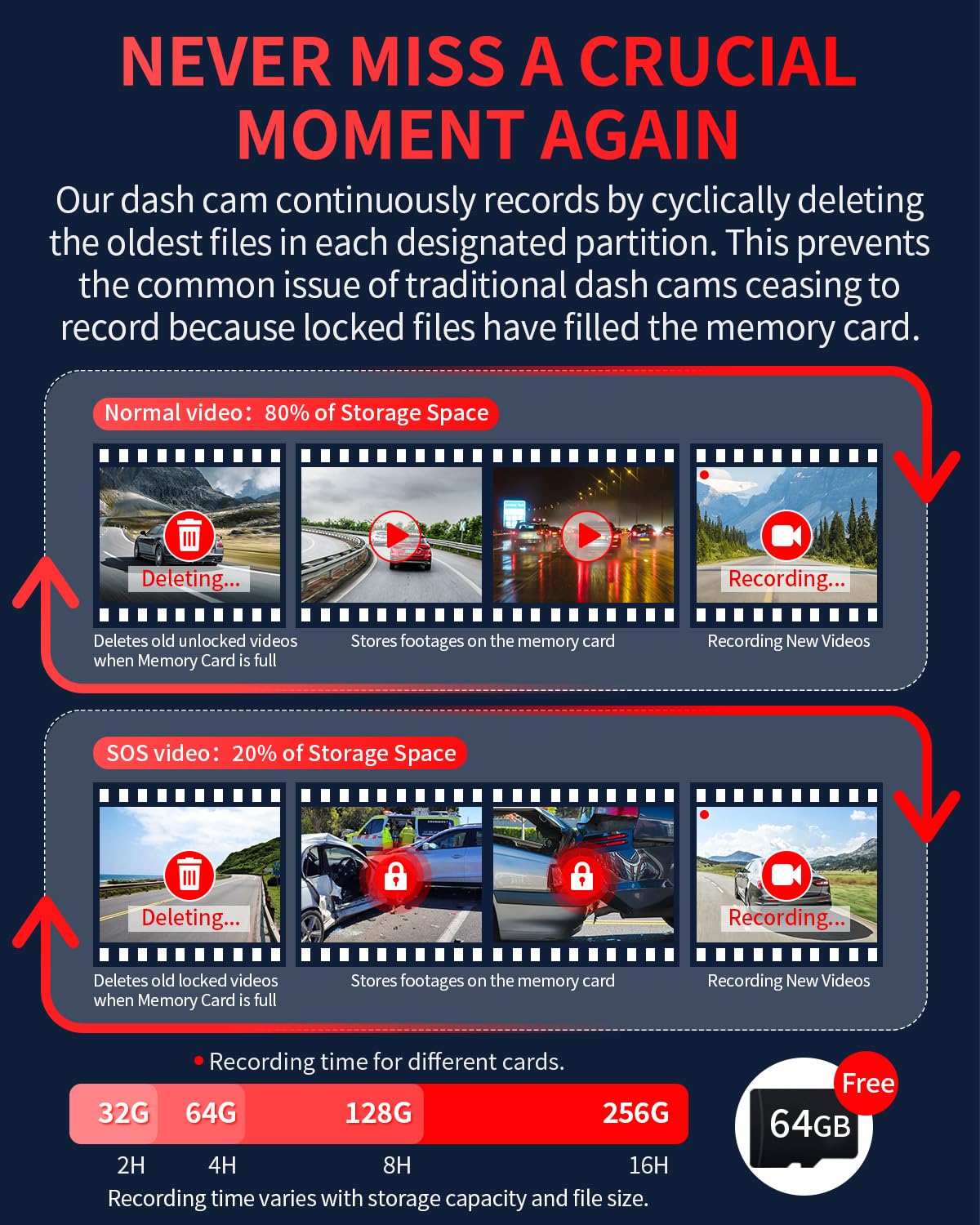 • Memory Card Failure Alert to Protect Data: When the memory card fails (due to damage, disconnection, or incompatibility), the dashcam emits a continuous 'DIDI' audio alert to prompt the driver to take immediate action, preventing recording interruptions. Dual storage loops independently to ensure that every second is securely recorded without interference between emergency and regular videos.
