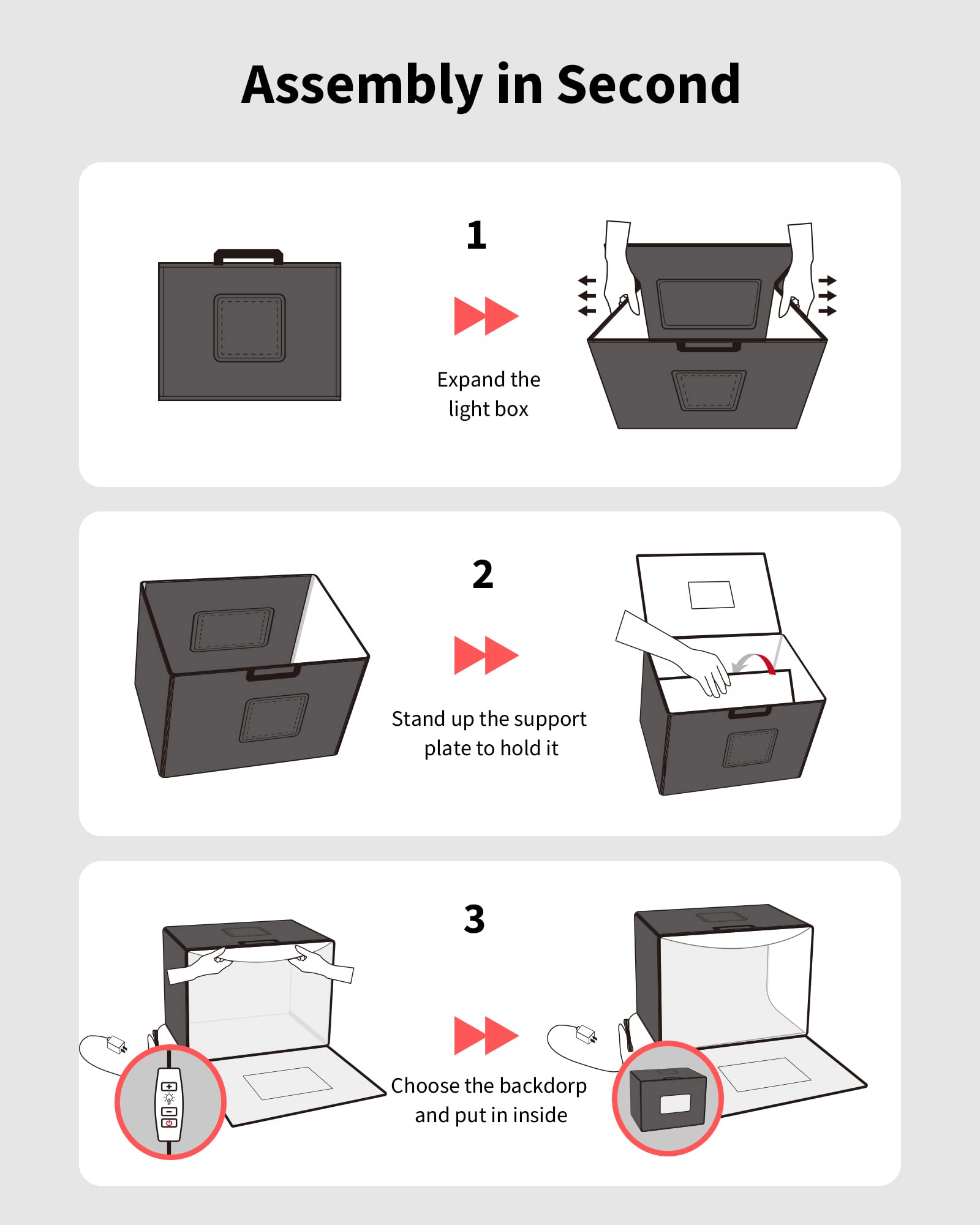 • Package & Friendly Service:1 x Photo Studio Box, 1 x LED Lights (112 pcs Beads), 6 x Backdrops with 8 Color ( Black/White / Blue/ Gary/Marble White, Marble Black, Dark Wood Grain, Light Wood Grain), 1 x Light Diffuser,4 x Reflection Boards, 1 x User Manual, 1 x Non-Woven Tote Bag. It is backed with a 12-month warranty and lifetime friendly customer service. If you have any questions about the product, please tell us what problem you meet, we will try our best to give you a satisfying solution.