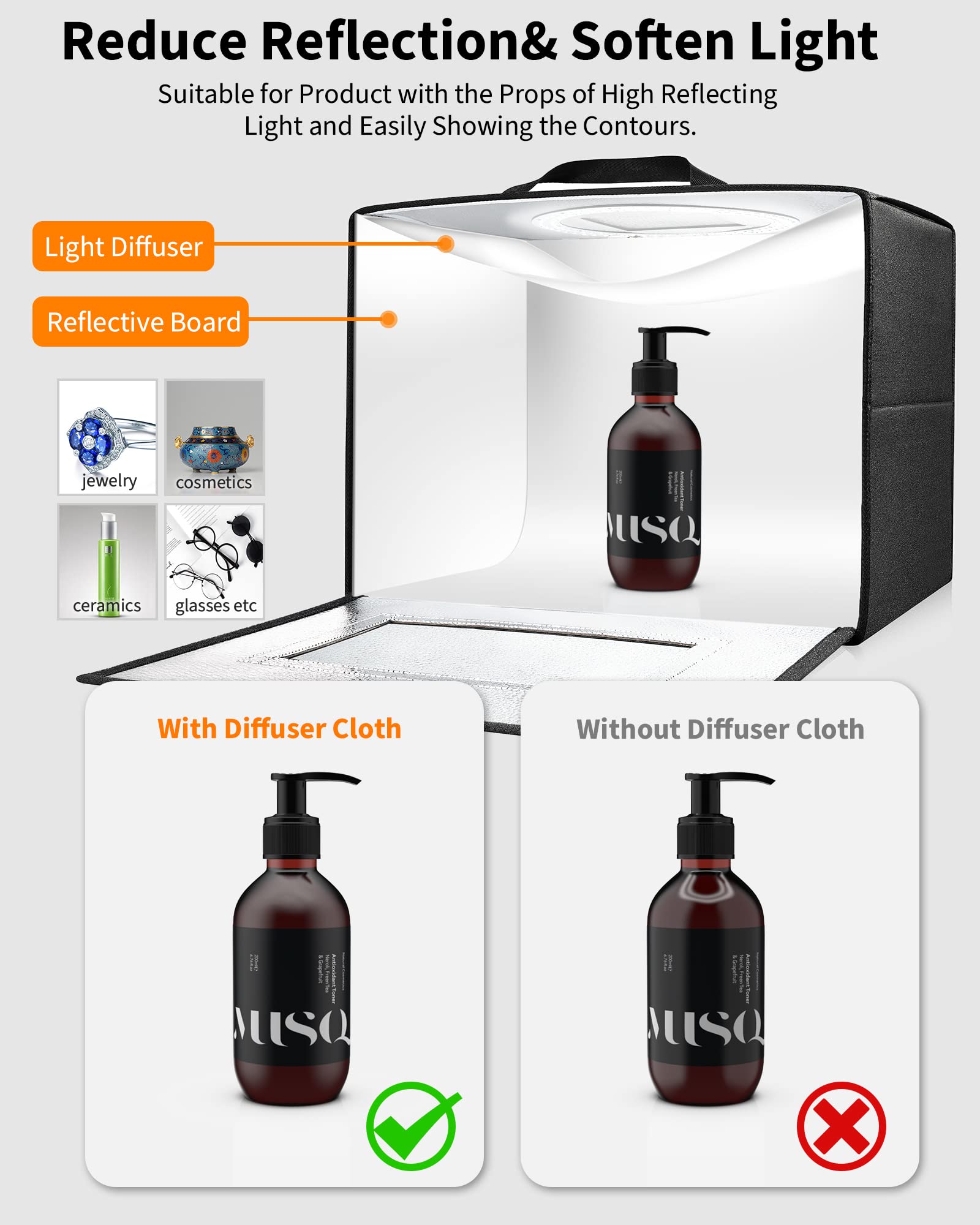 • Advanced Photography: Photo box extra provide the special inner reflection boards and light diffuser, which is the best practice for fixing the problem of products’ highly reflecting light and performing more details of the contours. Not only for junior photographers, but also for advanced photographers and professionals.