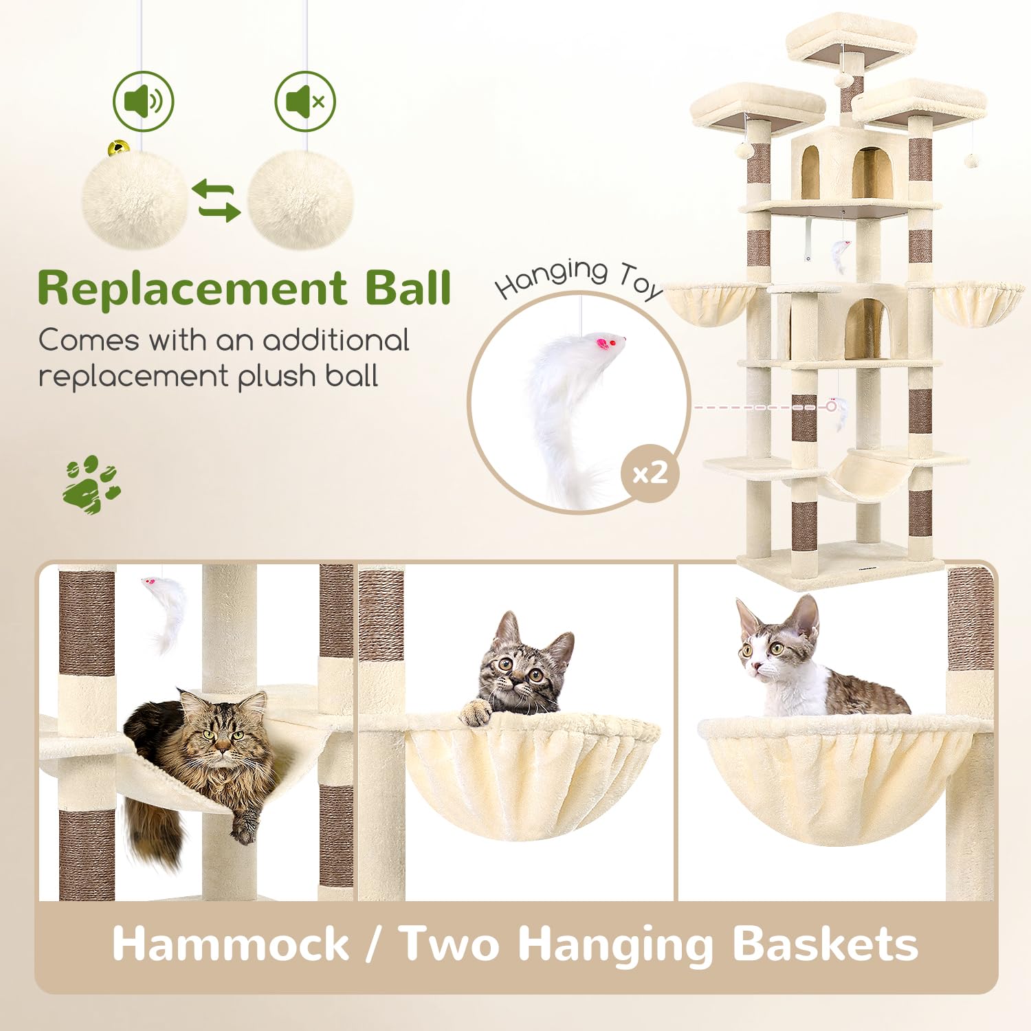 Globlazer Big Cat Tower for Indoor Cats, 80inch Cat Tower for Multiple Adult Cats XXL Cat Tree with Scratching Post, Hammock, 3 Perches, 2 Condos, 2 Hanging Basket, F80, Beige