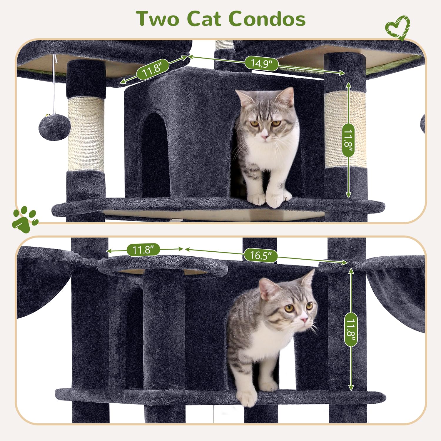 • Spacious Cat Condos: This tall cat tower with spacious cat condos serves as a private retreat where your cats can hide away, rest undisturbed, or engage in solitary activities.