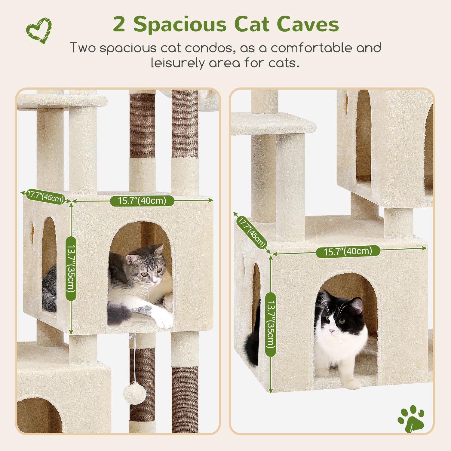 • SPACIOUS CAT CONDOS - The two generously sized cat condos for indoor large cats measuring 17.7'x 15.7'x 13.8' each provide cozy retreats. Isn't one enough? There are two on this cat tree. Ideal for adult cats to seek a quiet spot to rest or observe their surroundings