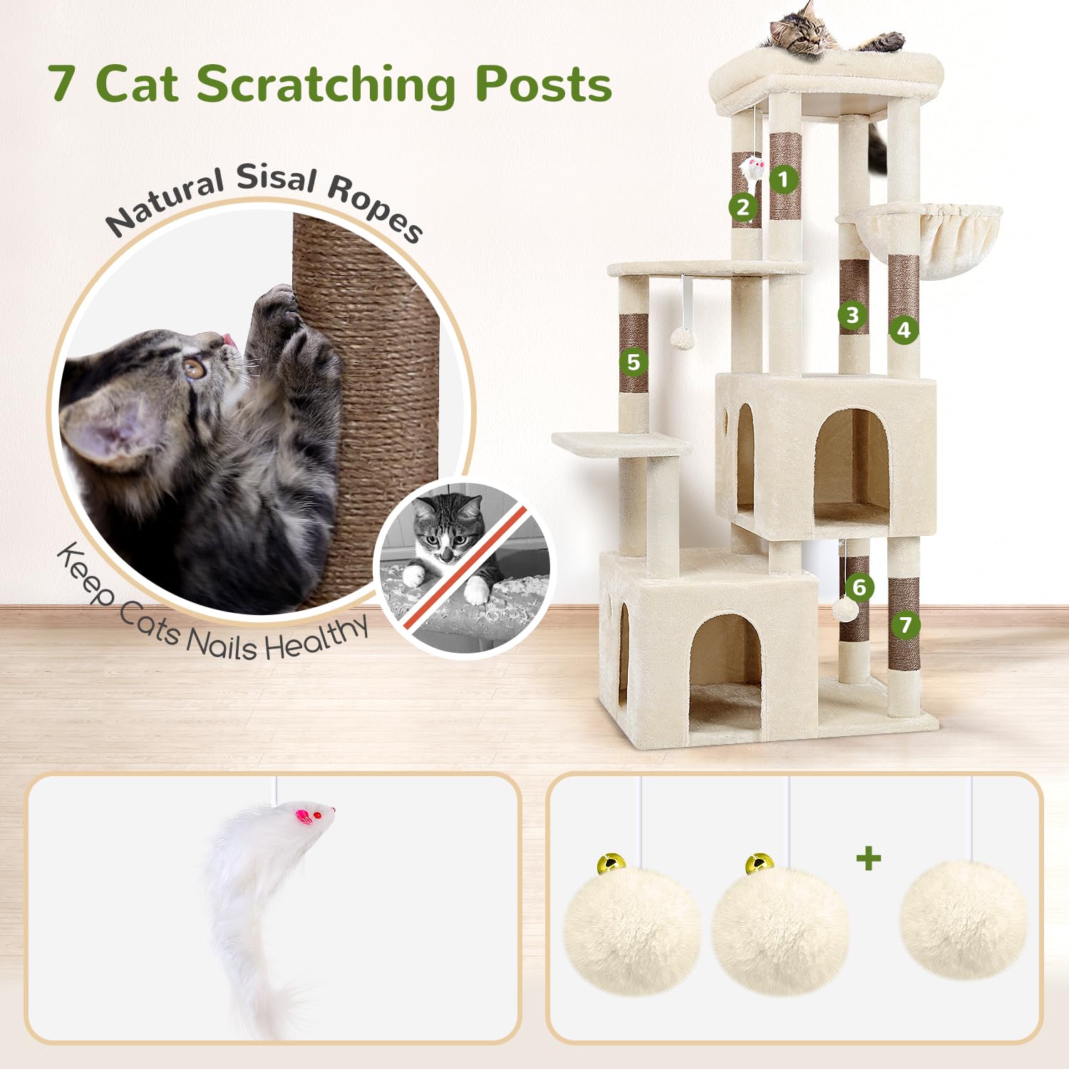 • CAT TOWER WITH SCRATCHING POST - The inclusion of seven natural sisal scratching posts not only promotes healthy scratching behavior but also helps maintain your cat's claws and protect your furniture
