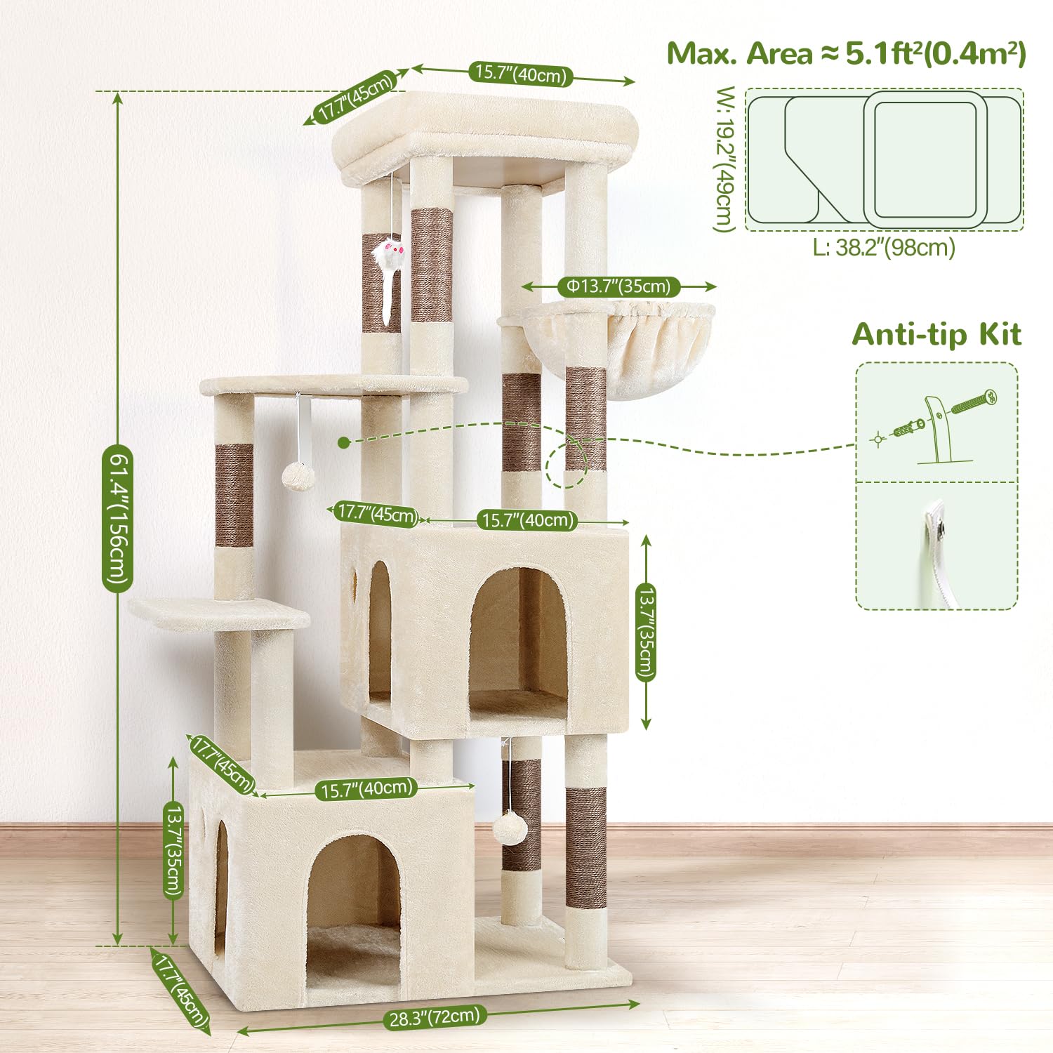 • COMPREHENSIVE DESIGN - The 61-inch cat tree is crafted to cater to the diverse needs of large adult cats. With multiple levels and features, offers a vertical space for climbing, lounging platforms for relaxation, and interactive toys