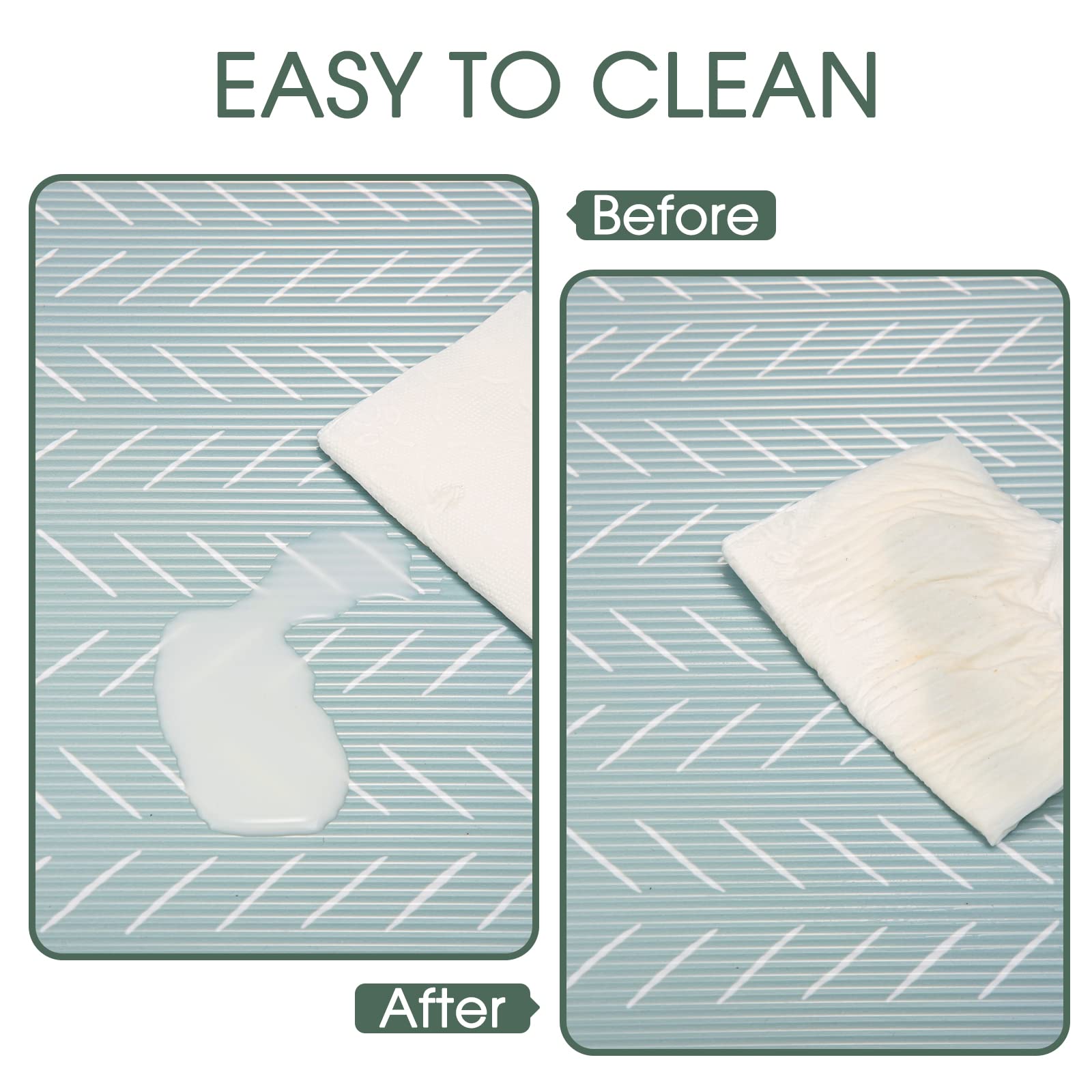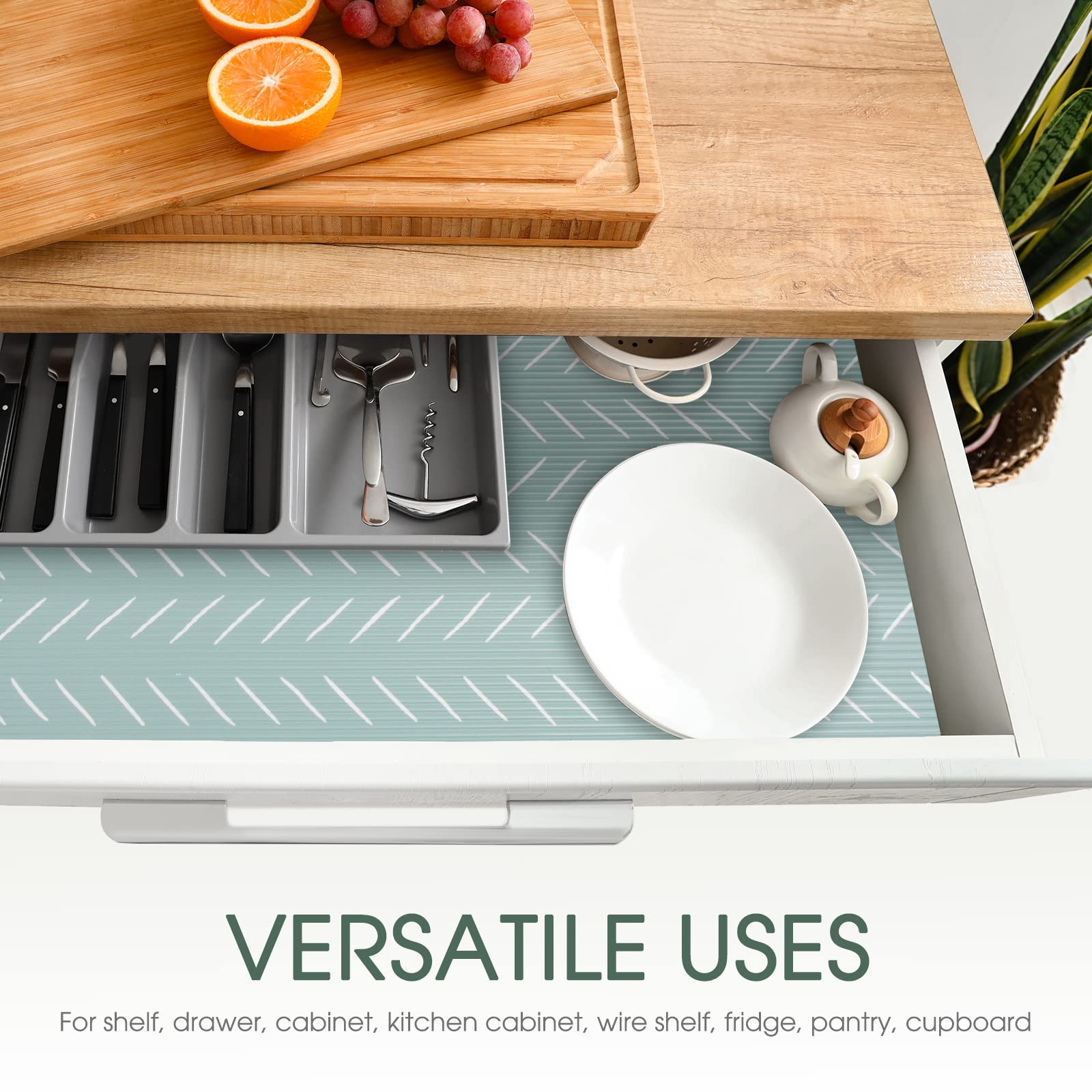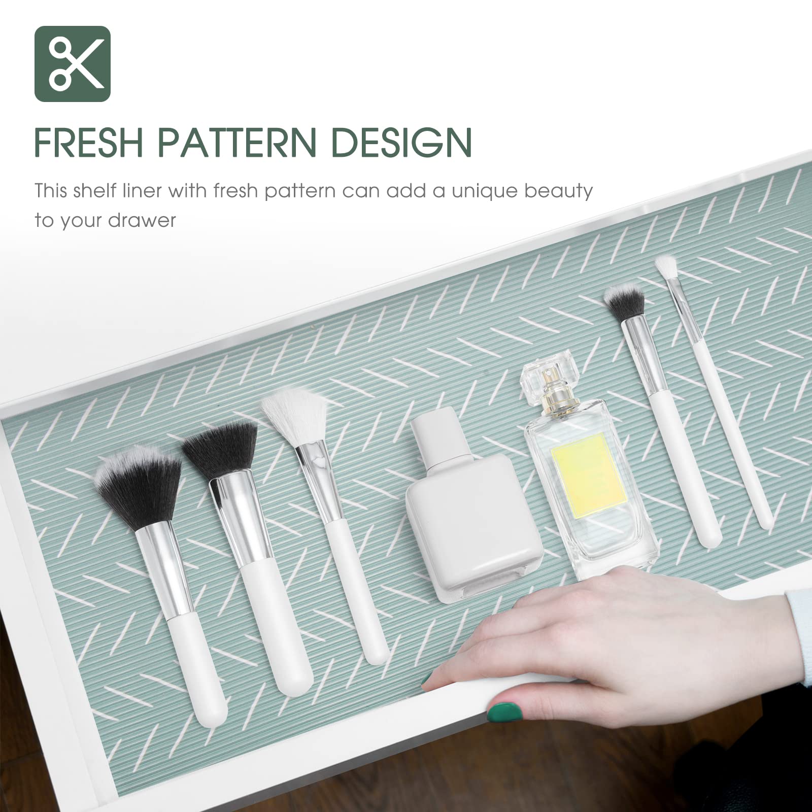 • Non Slip Shelf Liner for Storage Solution:Measured 17.5” x 30 Ft. with a non-slip double-sided mat, the shelf liners help prevent spills in storage spaces by keeping your items locked in place and free from unwanted dirt and debris. The green herringbone design of this wire shelf liner is not only beautiful but also effective to secure your belongings on the wire shelf, glass shelves and so on