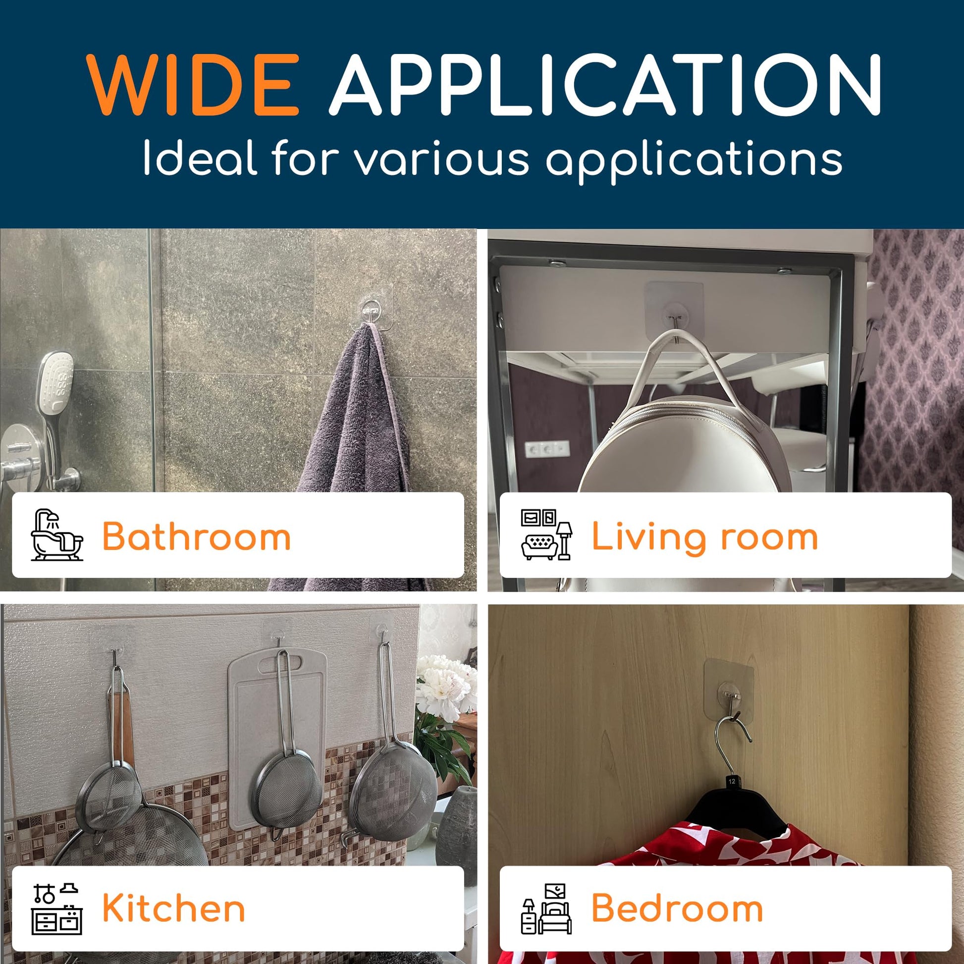 • Premium materials: Adhesive hooks crafted from robust stainless steel and durable PVC; high quality and longevity; remain clean and unaffected by time; non-toxic, recyclable, and transparent.
