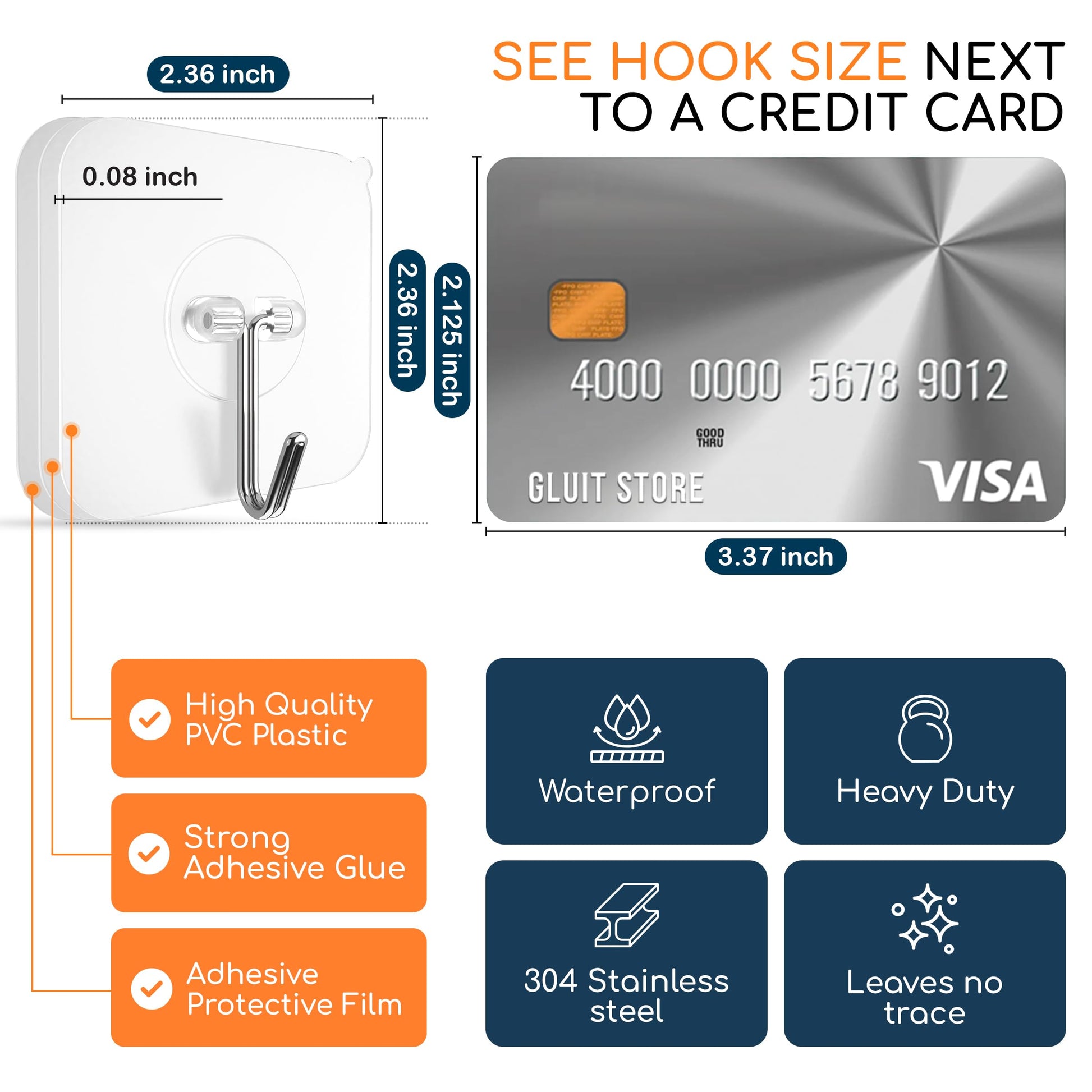 GLUIT Adhesive Wall Hooks for Hanging Heavy Duty 22 lbs Hooks for Walls No Damage, Towel Sticky Clear Hooks, Waterproof, Home, Bathroom, Kitchen, Office, and Outdoor, 40 Pack