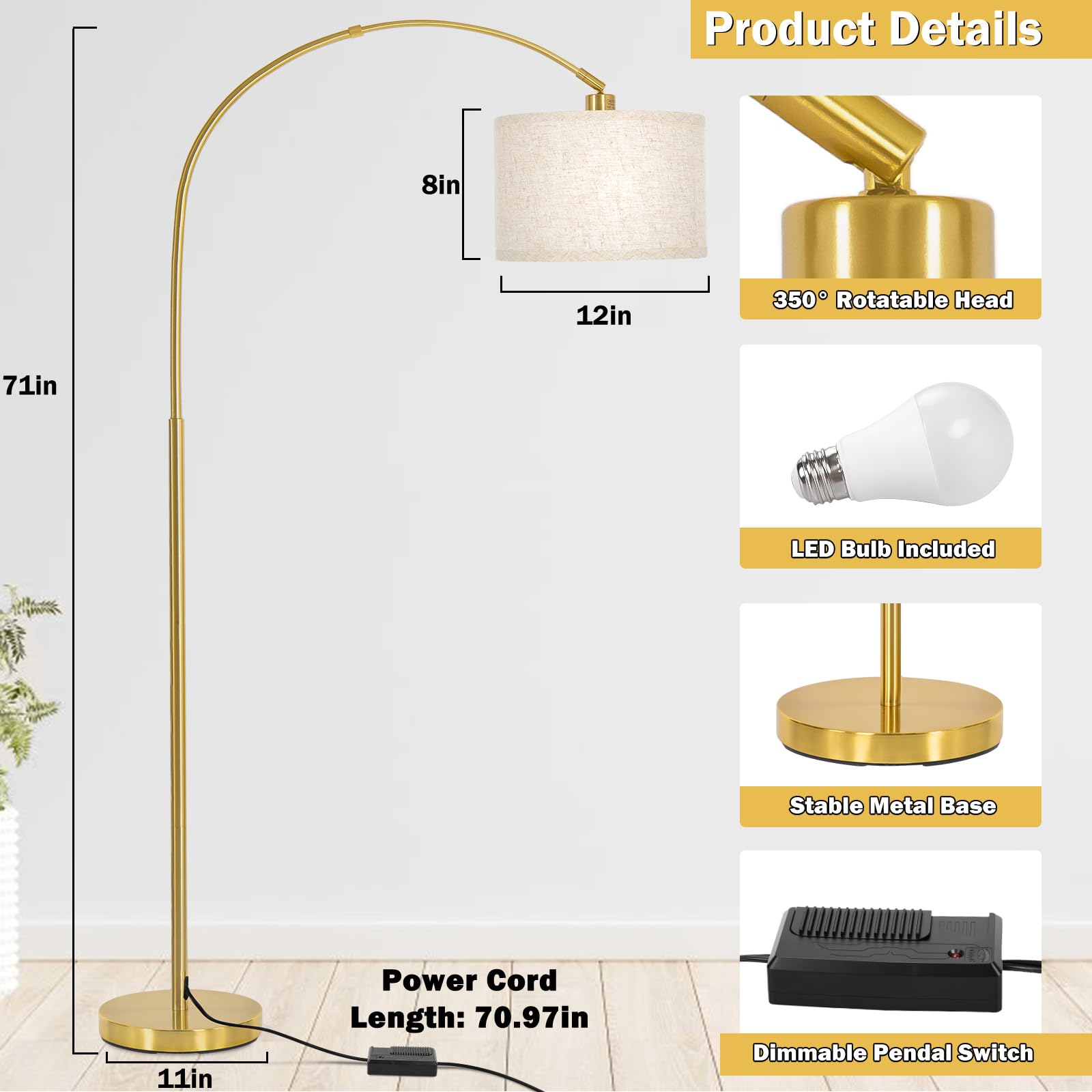 • Practical Stepless Dimming Function: Controlled by a foot dimmer switch on the power cord, this gold floor lamp provides 0-100% smooth brightness to meet your daily lighting needs. No need to stoop down to reach out, an easy push with feet will enable you to customize the brightness from dim to bright, great companion for reading, working, leisure and resting.