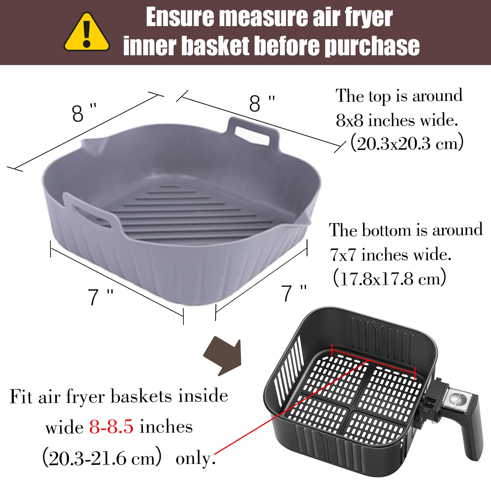 • Measure Before Purchase: We strongly recommend that you measure the internal dimensions of the air fryer basket; the square silicone liner measures 8x8 inches wide at the top and approximately 7x7 inches wide at the bottom; fit a square-shaped air fryer and internal width of its basket is 8 to 8.5 inches