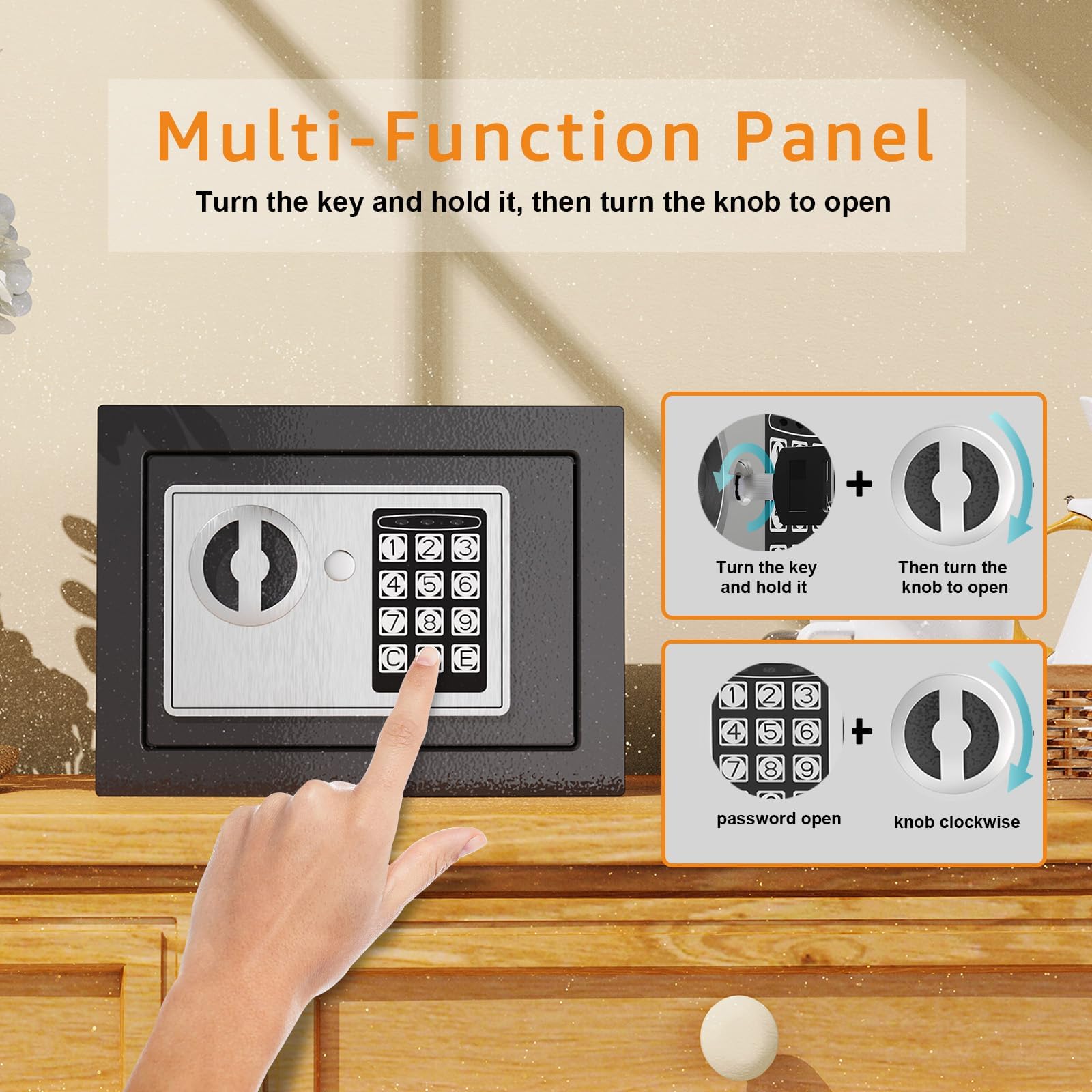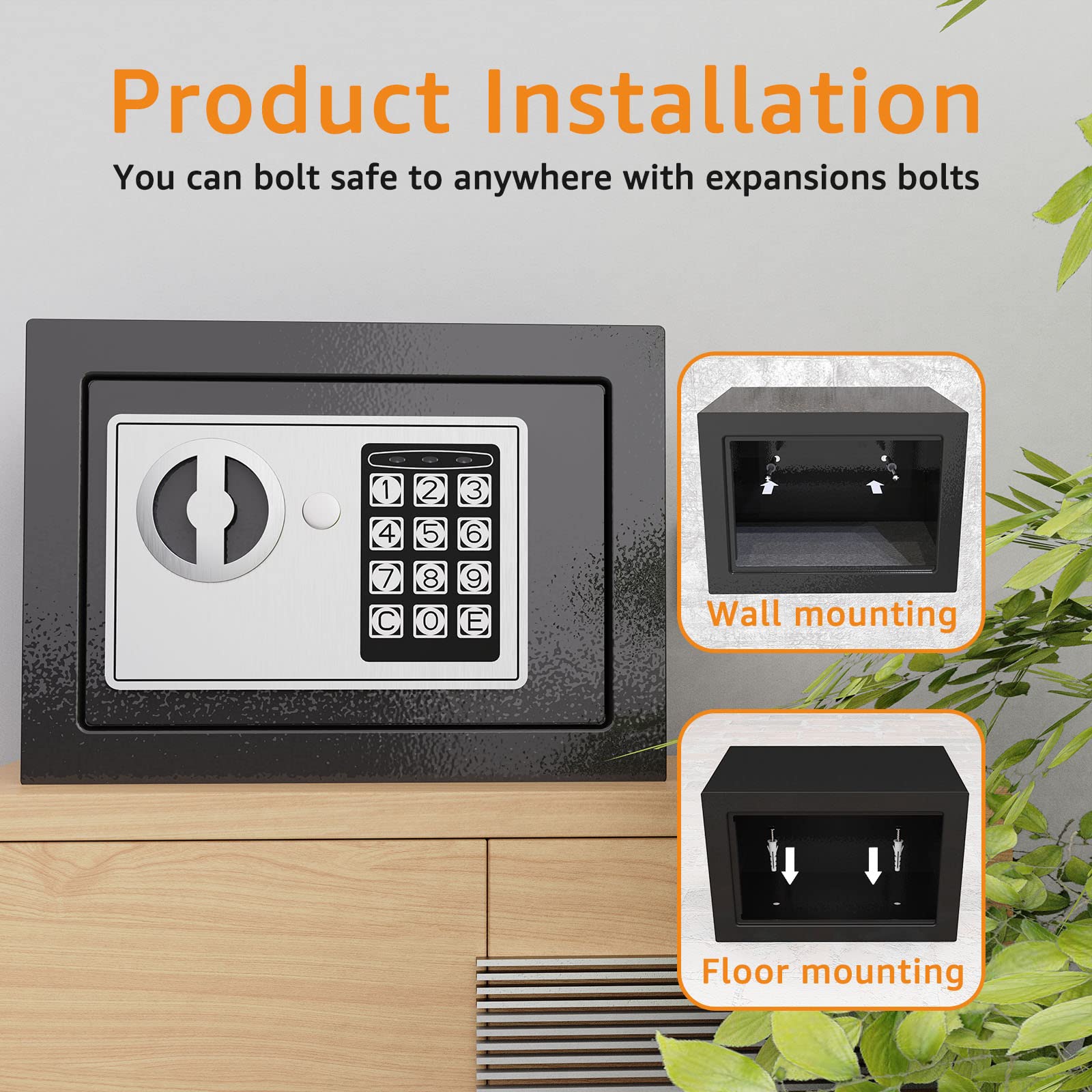 • ✅ Compact & Versatile: Measuring just 6.7'' x 9.0'' x 6.7'', this safe is designed to fit seamlessly under a closet, drawer, or table. Despite its compact size, it offers a 0.3 cubic feet capacity, providing ample space to store your cash, jewelry, important documents, and other valuables. Whether you need secure storage for your home or are looking for a thoughtful gift, this safe is the perfect choice.