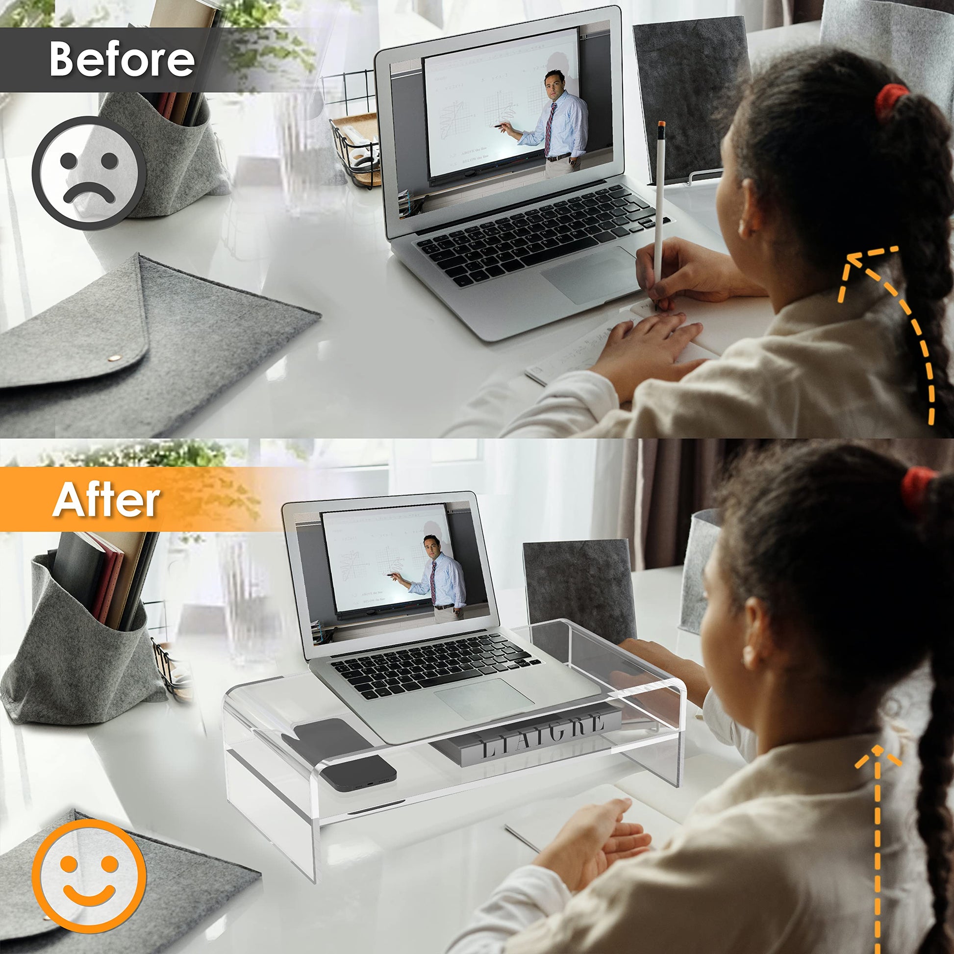 • You can use this acrylic stand riser for your laptop or monitor, it can also be used to organize items such as books and office accessories. Whether at home or office, this multi-purpose computer riser is highly practical