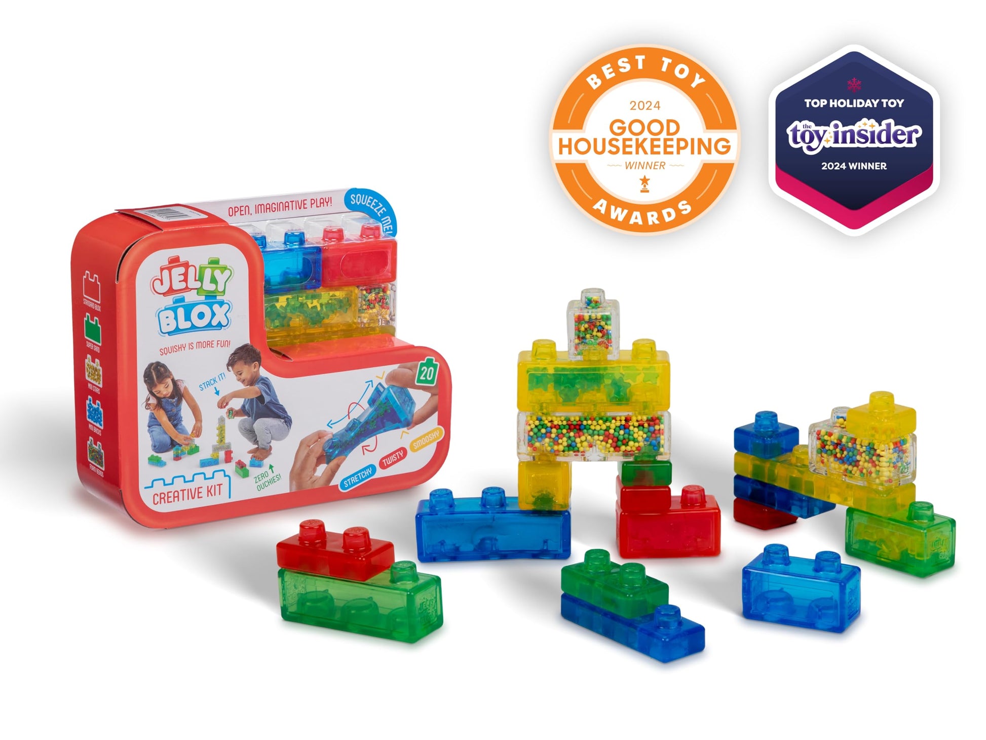 Details: Jelly Blox - the only blocks that bend the rules! Jelly Blox is a patent-pending building system for toddlers and preschoolers that kids can squeeze, stretch, and squish! Designed to support key developmental milestones through the fun of tactile, sensory play, Jelly Blox delivers jiggly construction fun. A few special blocks are also filled with fun sensory fills like sand, foam balls, mini stars, and mini bricks to dial up the fun! Oh, and a bonus for parents - not only are Jelly Blox safety tested to ensure worry-free play, but they’re also totally ouch-free; no need to dread those accidental encounters with bare feet! With Jelly Blox, it’s all about bending the rules and stretching the imagination! The Jelly Blox Creative Kit includes 20 blocks for hours of construction fun! Recommended for ages 2 and up.