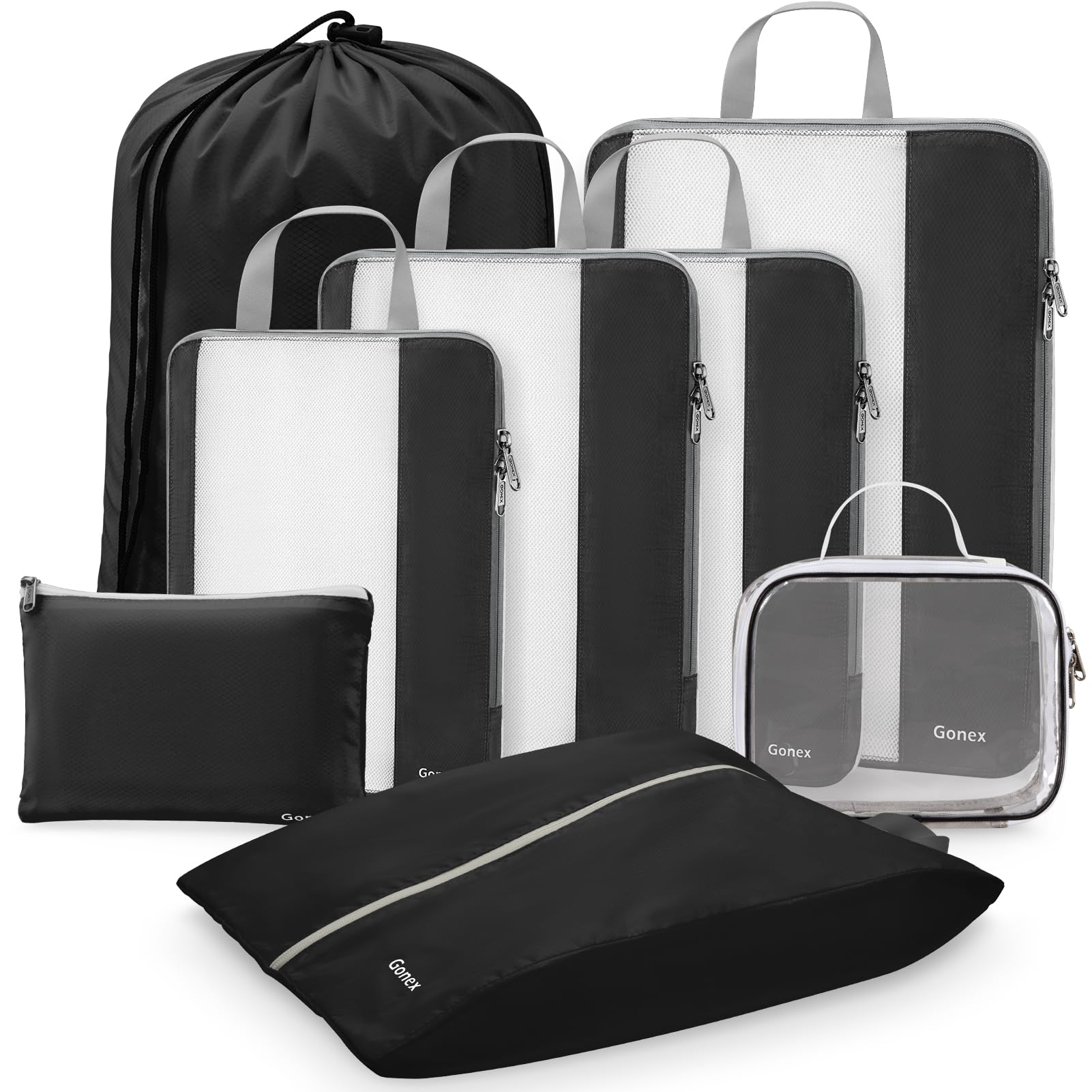 Gonex Expandable Mesh Packing Cubes - 8 Set Compression Organizer for Travel Essentials with Toiletry, Laundry, Shoe & Cable Bags - Black