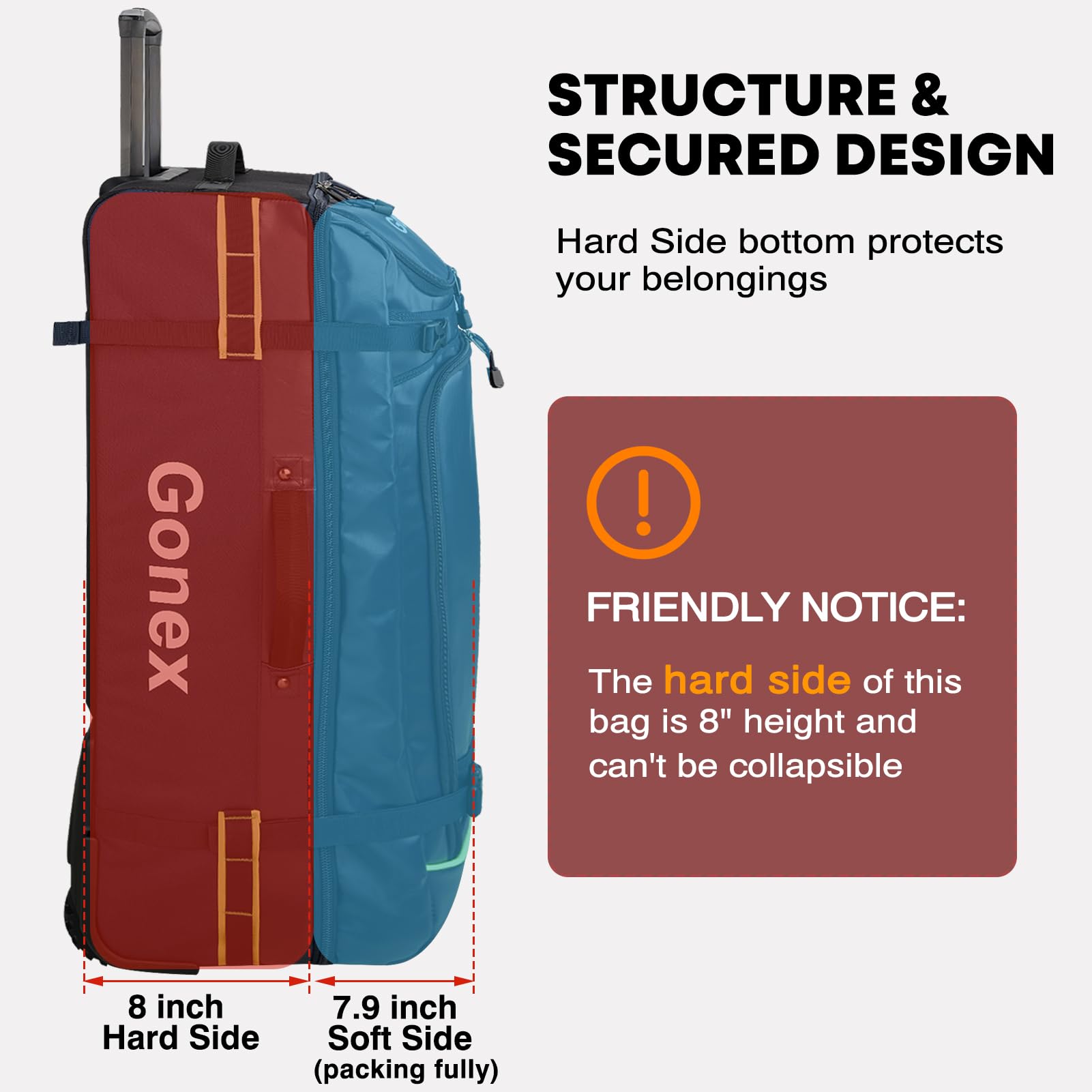 • Premium Material: Made of 1200D high-density PVC fabric, waterproof, wear-resistant and lightweight, paired with durable YKK zippers. The alloy telescopic handle is ergonomically designed for handy and reinforced use