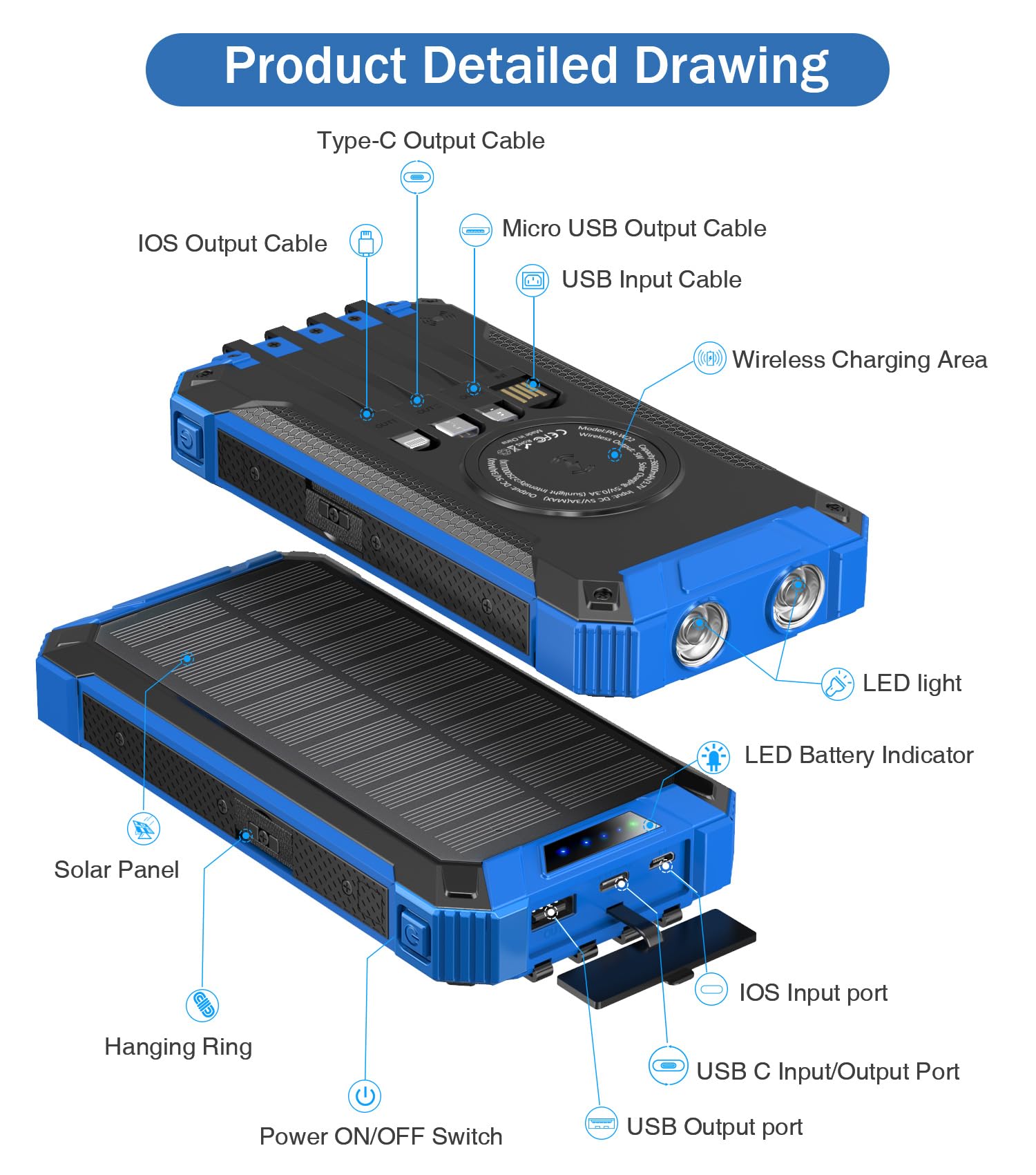 • [Power 6 Devices at Once] This solar charger is also equipped with 4 ports (iOS input, USB A output, USB C input/output), providing 5V/3A high-speed charging to save time. Along with 4 charging cables and wireless charging, it supports charging 6 devices simultaneously. Keep all your devices alive. Sharing with families and friends is perfect.