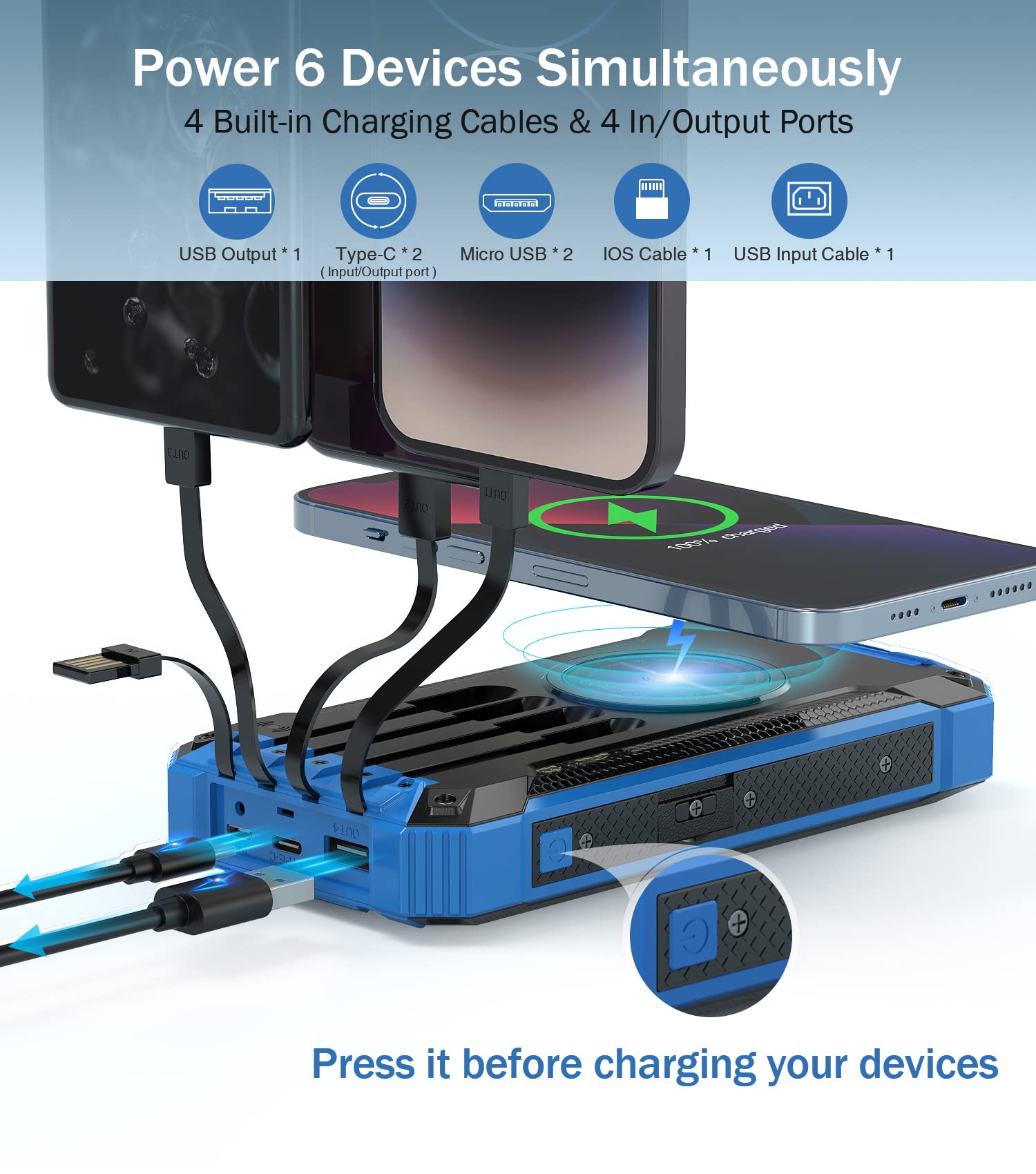 • [Built-in 4 Charging Cables] This power bank is built with 3 output cables ( Type C*1 & iOS*1 & Micro USB*1) and 1 USB-A input cable. No matter output or input, you don’t need to carry charging cables. Get rid of messy cables, charge at anytime and everywhere.