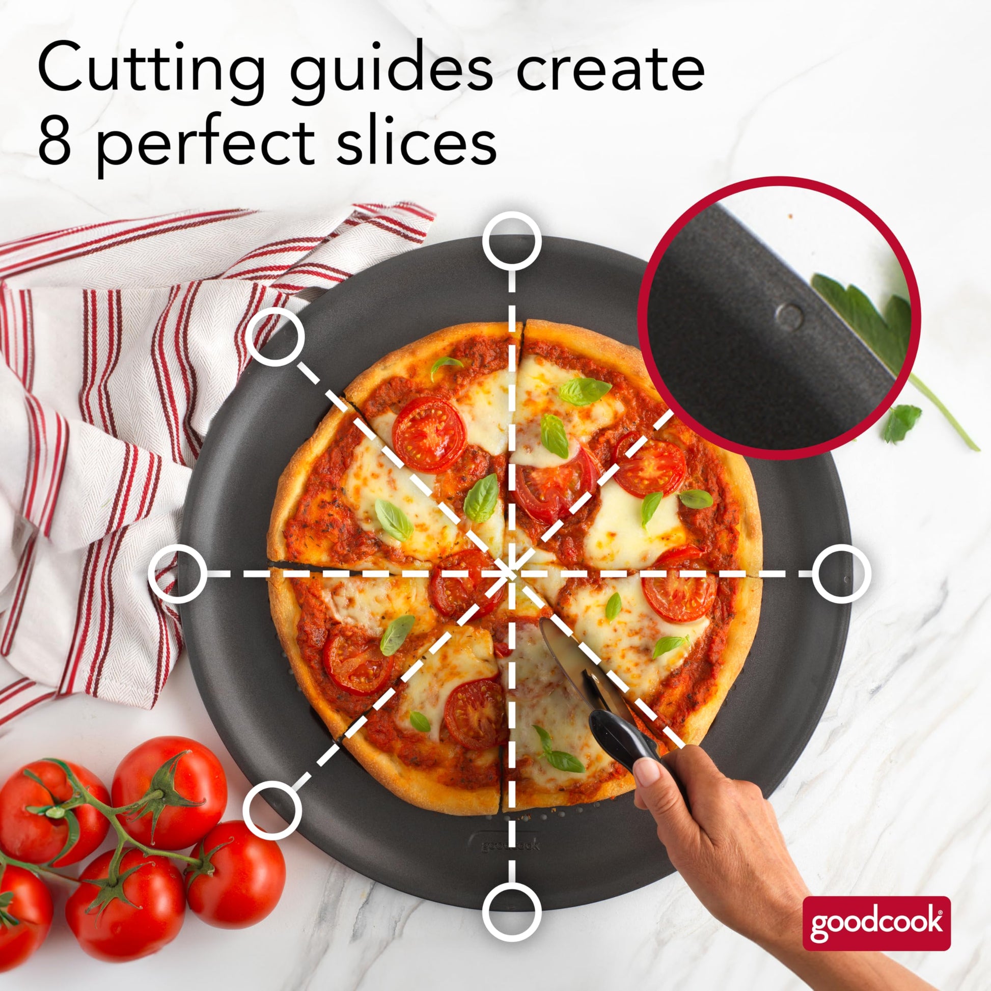 Details: Bring premium bakeware to your home kitchen with the GoodCook 16" Pizza Pan. This nonstick pizza pan ensures even heating and is perforated to reduce moisture for a perfectly crispy crust when making homemade pizza. Designed for anyone, it is also great for baking frozen pizzas and reheating leftover slices. The convenient cutting guides make it easy to serve perfectly even slices, while the feet on the bottom keep the hot pan elevated and off the countertop. The nonstick coating provides excellent release and makes cleanup quick and easy. This large pizza pan measures 15.75" in diameter and is made of nonstick carbon steel for premium-grade construction that resists warping to offer delicious baking for years to come.