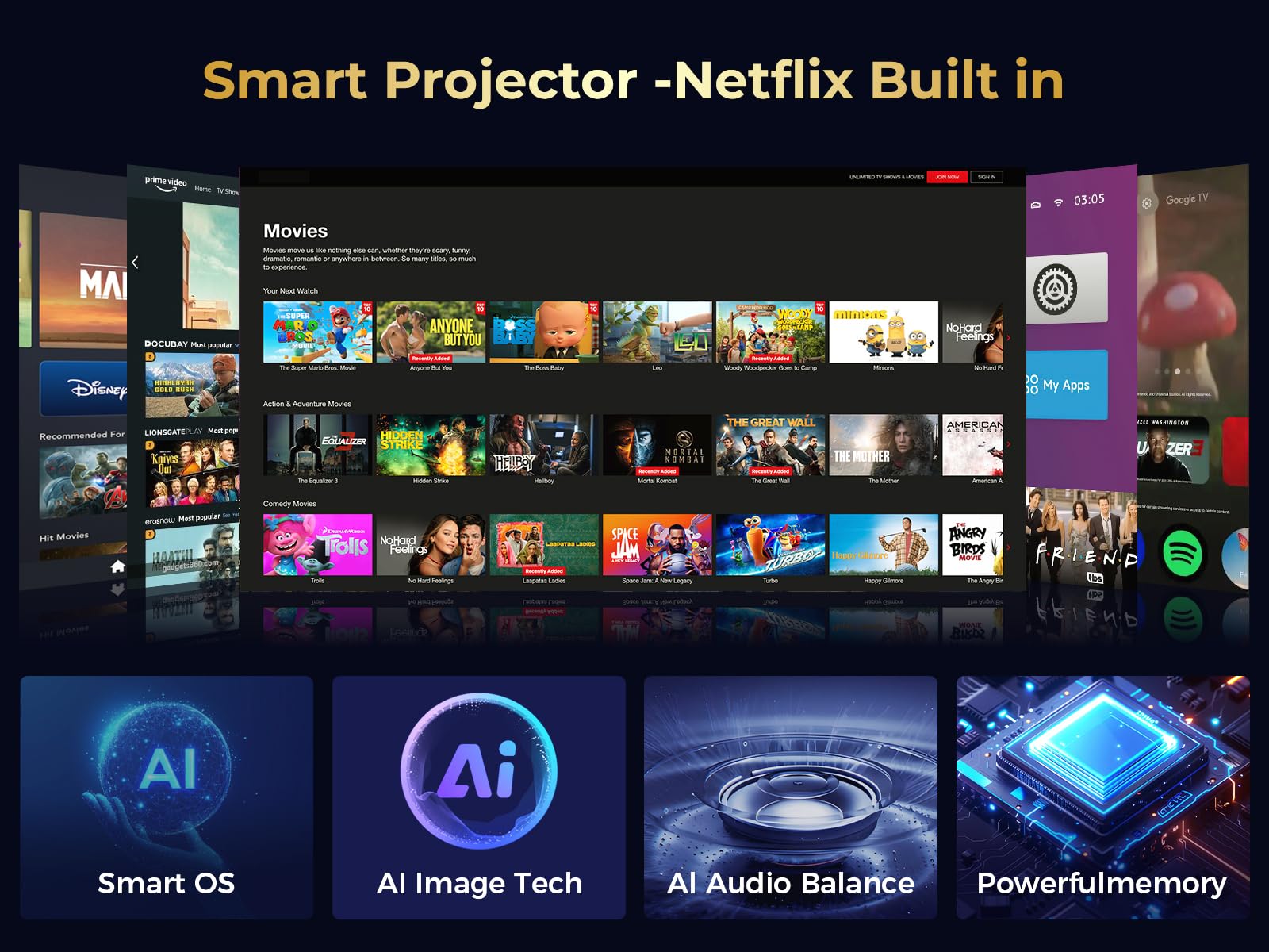 • Smart Projector with Netflix Built-in: The GooDee upgraded YG600-Movin got the authorization from Netflix/Prime Video/YouTube etc which allows you play video movie directly. Mirror or cast from mobile phone cannot play movie (for Netflix/Amazon Prime Video/YouTube etc) due to copyright issue. Support wireless screen mirroring for IOS, Android, and Windows devices