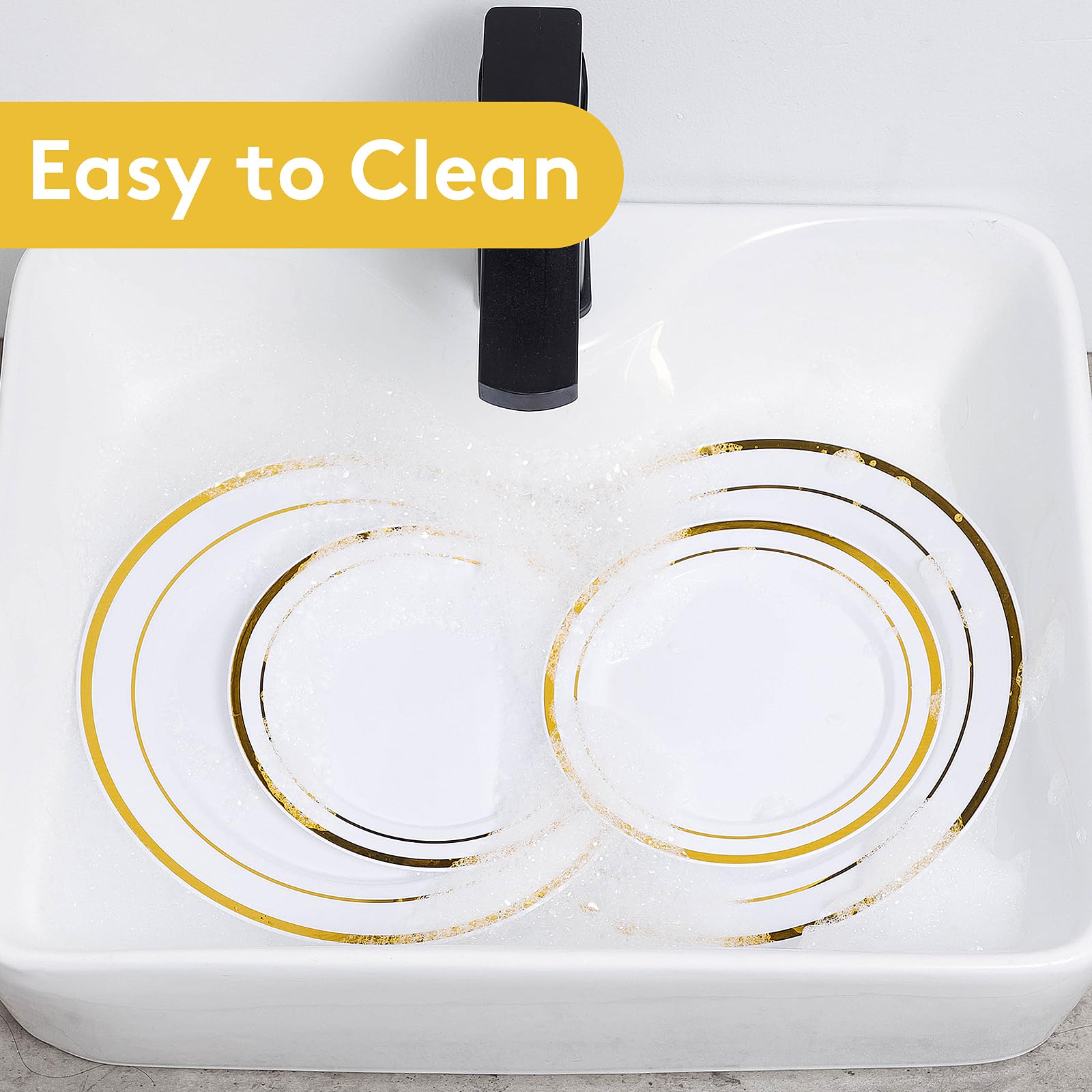 • ELEGANT DESIGN - These disposable plates with a gold rim around the edge, these disposable dinner plates exude sophistication and elegance, reminiscent of luxurious china dinnerware. And instantly elevate any dinnerware setting, and will impress guests at any party or event.