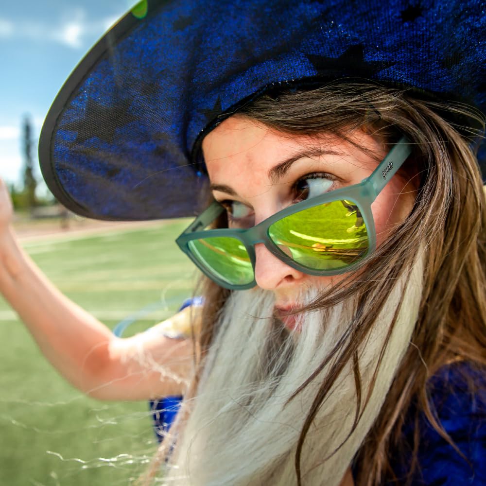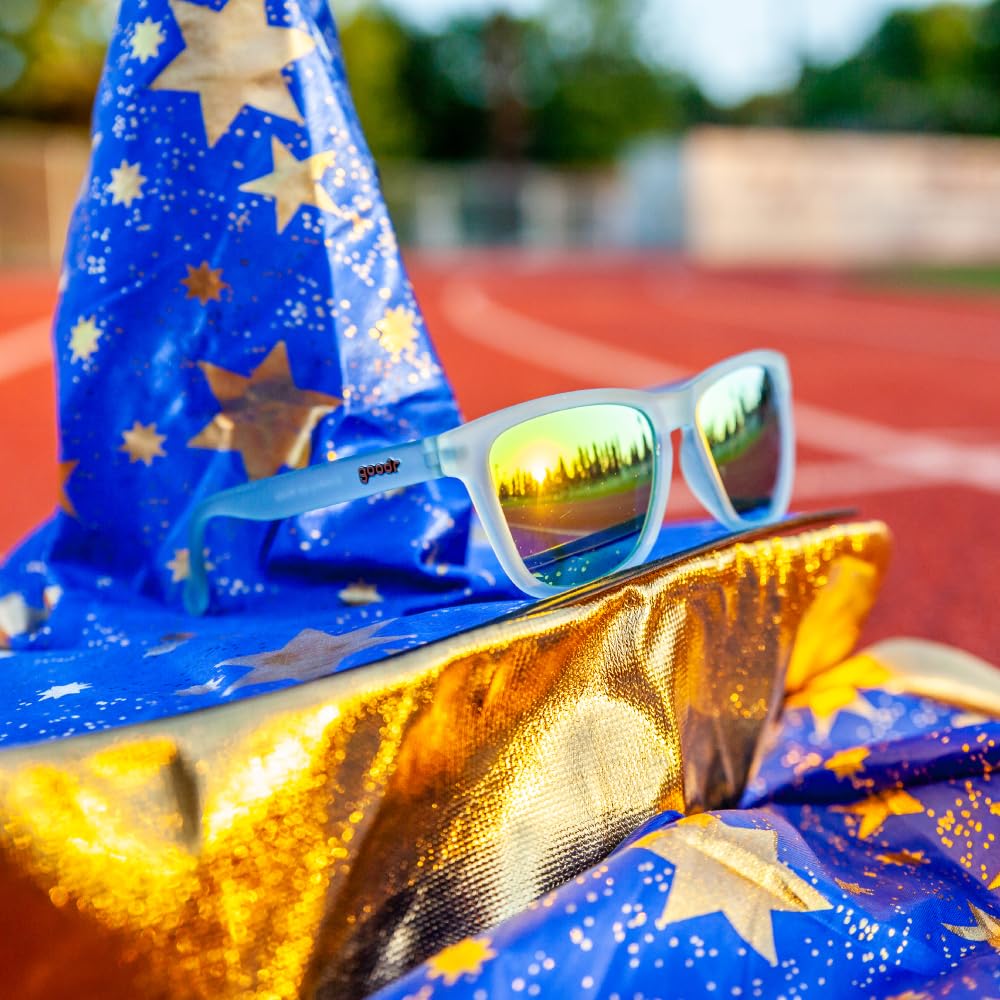 goodr Sunbathing with Wizards Polarized Sunglasses for Men & Women, Medium Sized (OG), Light Blue Translucent Frames with Gold Mirrored Reflective Lenses, UV400 Protection, No Slip, No Bounce