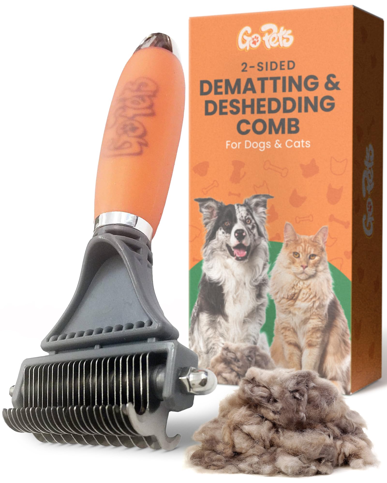 GoPets 2-Sided Dematting & Deshedding Comb for Dogs & Cats, Versatile Undercoat Detangler Brush for Shedding, Matted Hair & Fur Remover Tool, Stress-Free Pet Grooming Rake with Ergonomic Handle