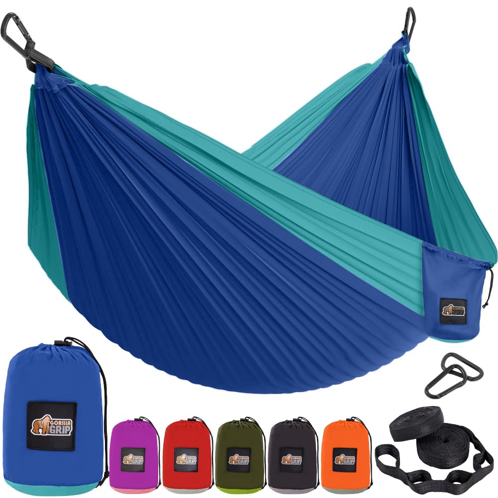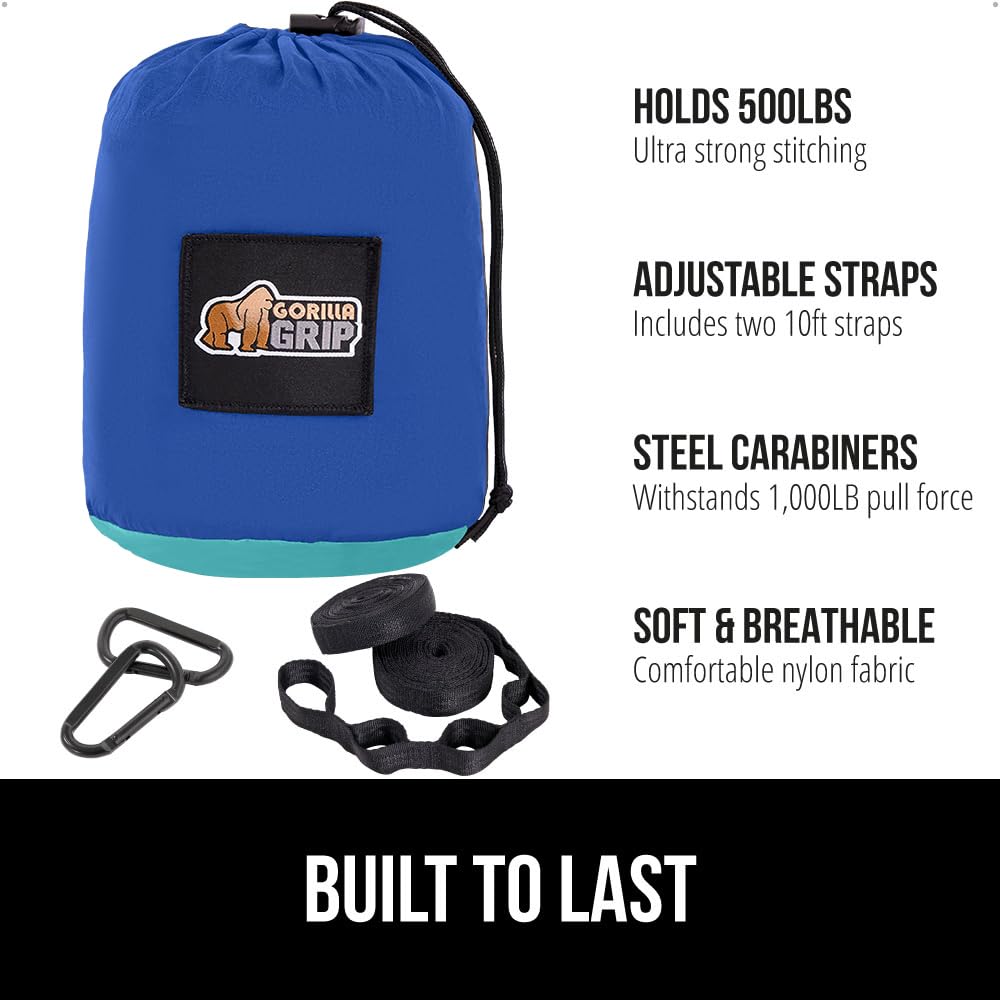 GORILLA GRIP Durable Portable Camping Hammock, Holds 500lbs with Heavy Duty Tree Straps, Comfortable Travel Swing, Camp Hammocks, Easy to Use and Install, Outdoor Essentials, Blue, 10x6.5 FT