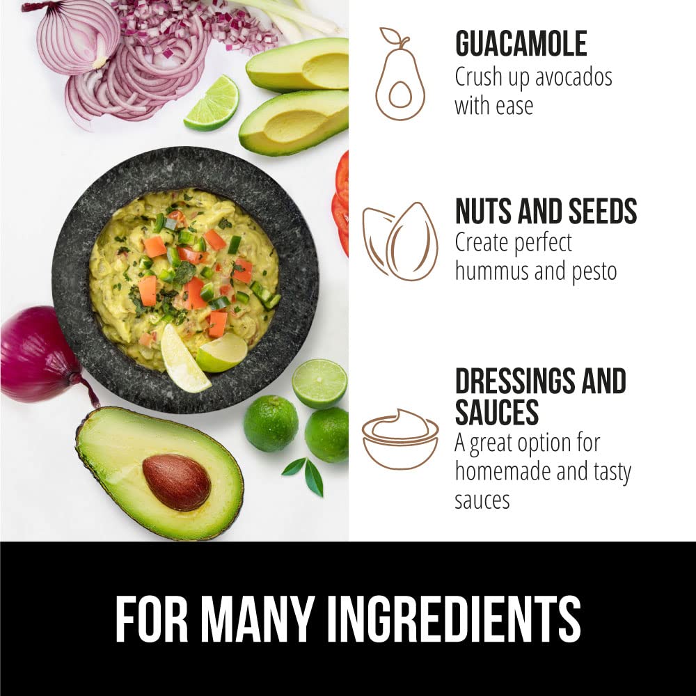 • GUACAMOLE, SPICES, NUTS, AND MORE: not just for guacamole, the mortar and pestle is a great option for nearly any ingredient; crush up spices and herbs; create homemade pesto by grinding up nuts and seeds; serve up fresh dips; even a great choice for homemade dressings and salsas; impress your entire guest list with the tastiest dishes ever