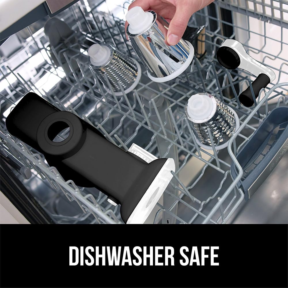 • POWERFULLY SLICE, GRATE, AND SHRED: the Gorilla Grip Rotary Grater helps save time on meal prep; food pusher keeps hands safe from blades; rotate the handle to slice and shred faster than by hand; spend less time in the kitchen, more time enjoying your meals