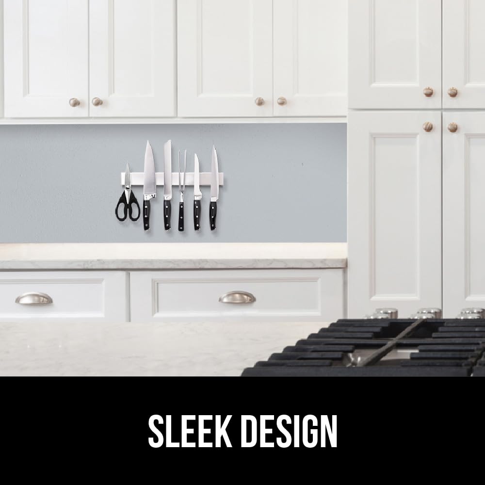 • STAINLESS STEEL CONSTRUCTION: constructed from 304 stainless steel, this magnetic knife holder is designed to last; a sleek and elegant satin finish will complement any kitchen space