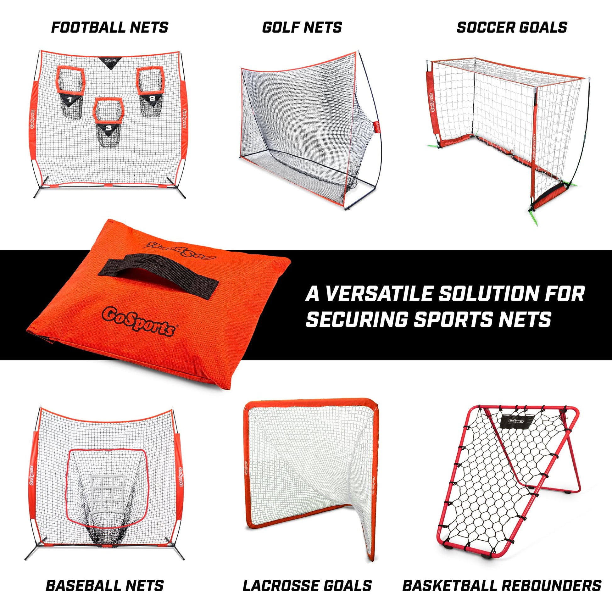 Details: The GoSports Sandbags provide a versatile solution for adding weight and stability to a variety of sports training nets to secure them in place during training drills. The set includes 4 sandbags (sand not included) that are easy to assemble and great for: soccer goals, football training nets, lacrosse goals, golf hitting nets, baseball picthing nets, sports rebounders and more! The sandbags are constructed from heavy-duty canvas and each bags holds 8-10lbs of sand which can be bought cheaply at most hardware stores. The sandbags can be securely attached to any sports net frame using the underside straps the provide more secure attachment compared to traditional sand bags. Whichever your sport, now you can practice at full force with the GoSports Sandbags!.