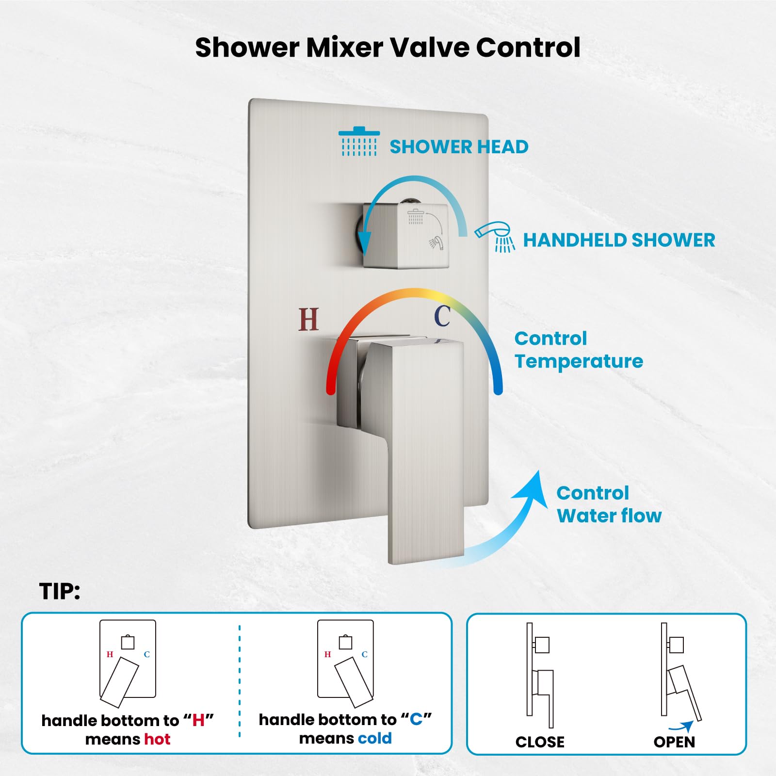 • 【Include】:12 inch Square rain shower head, handheld shower spray,59 inch shower hose,15.7 inch shower arm,handheld holder, pressure balance valve,panel,handle,cover and install hardware include.