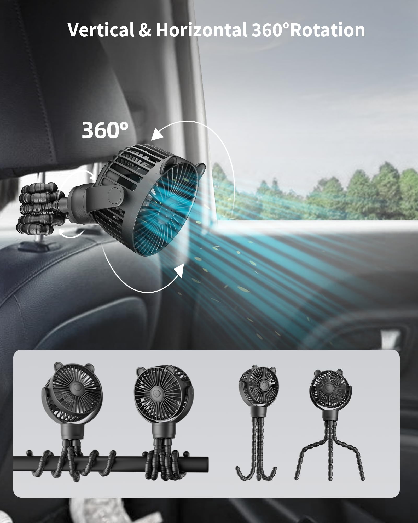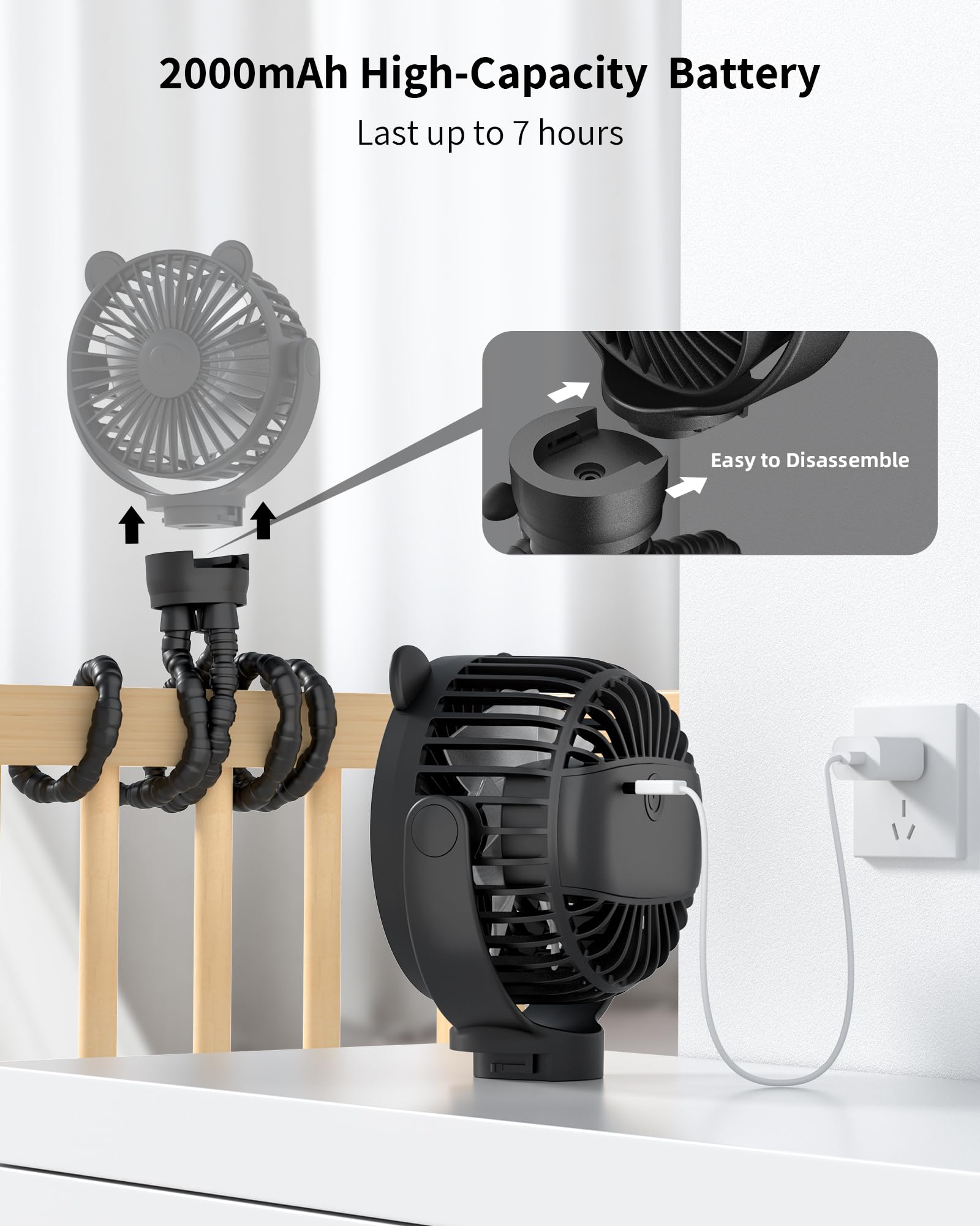 GOTOTO Baby Stroller Fan, Rechargeable Portable Fan with 2000 mAh Battery Operated,3 Wind Speed,360-Degree Rotation,Ultra-Low Noise Level,Safe mini fan for your baby