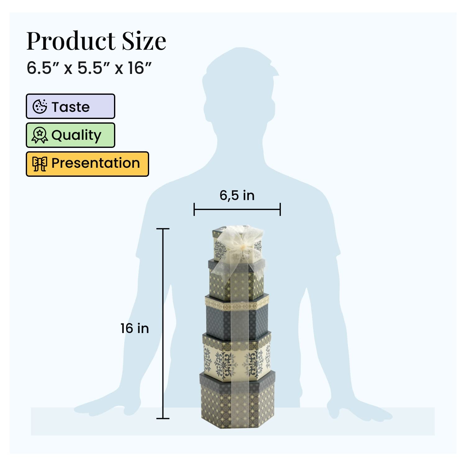 • REUSABLE CONTAINER: This gift tower measures 6' x 7' x 17' and includes 5 coordinating, stacked boxes. Reuse for decoration or storage for photos, mementos, and household items. Each gift includes a gift tag for a personalized touch.