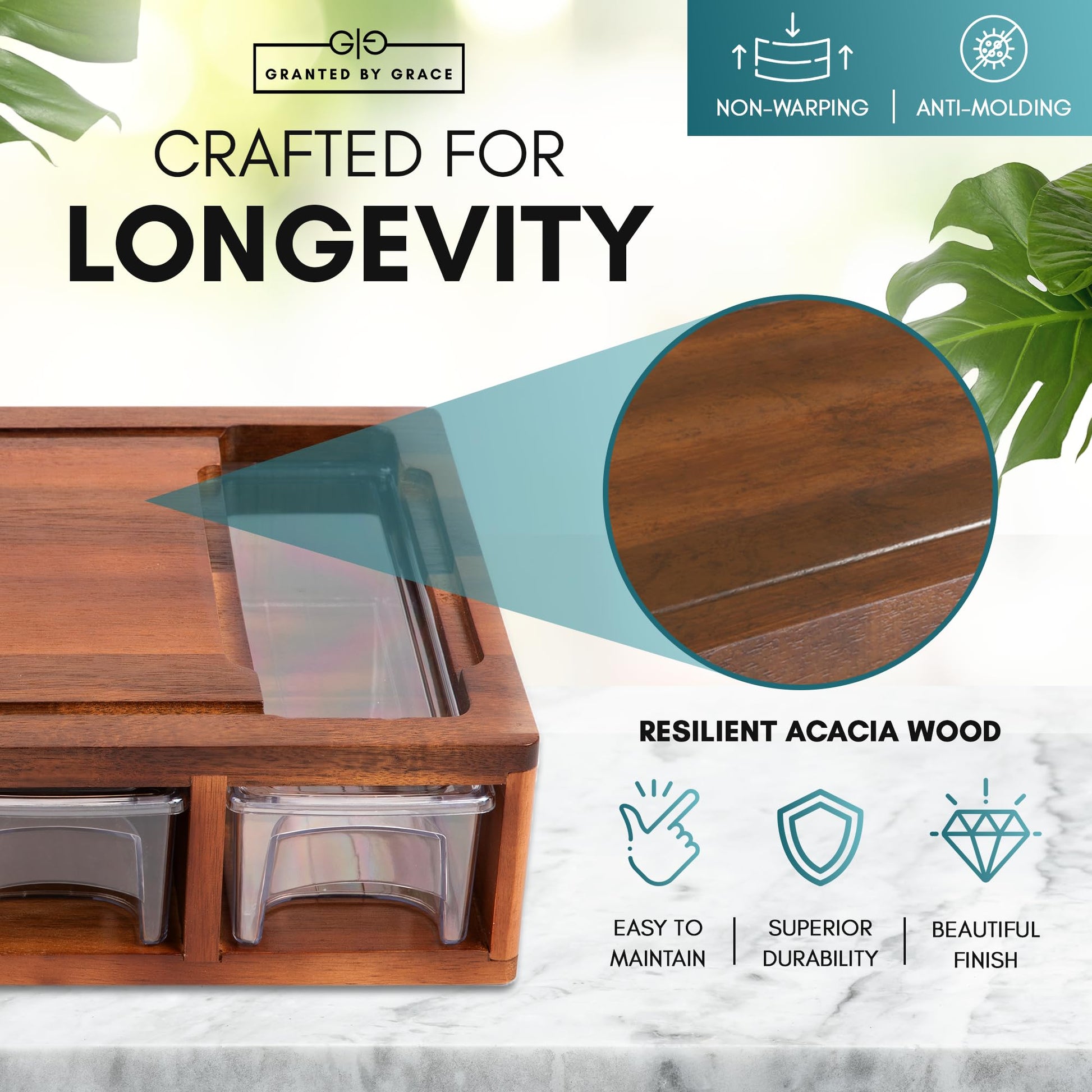 Granted By Grace Acacia Cutting Board with Containers & Lids - Board Meal Prep System w 4 Graters, 2 Plastic Chopping Board for Meat, Juice Grooves & More - Cutting Board Prep Station for Kitchen