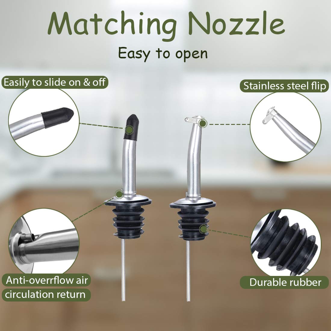 • HIGH-QUALITY MATERIALS: Thick, this olive oil dispenser is durable, made of BPA-free rubber stopper, made of tapered stainless steel nozzle and equipped with strong and unique glass.