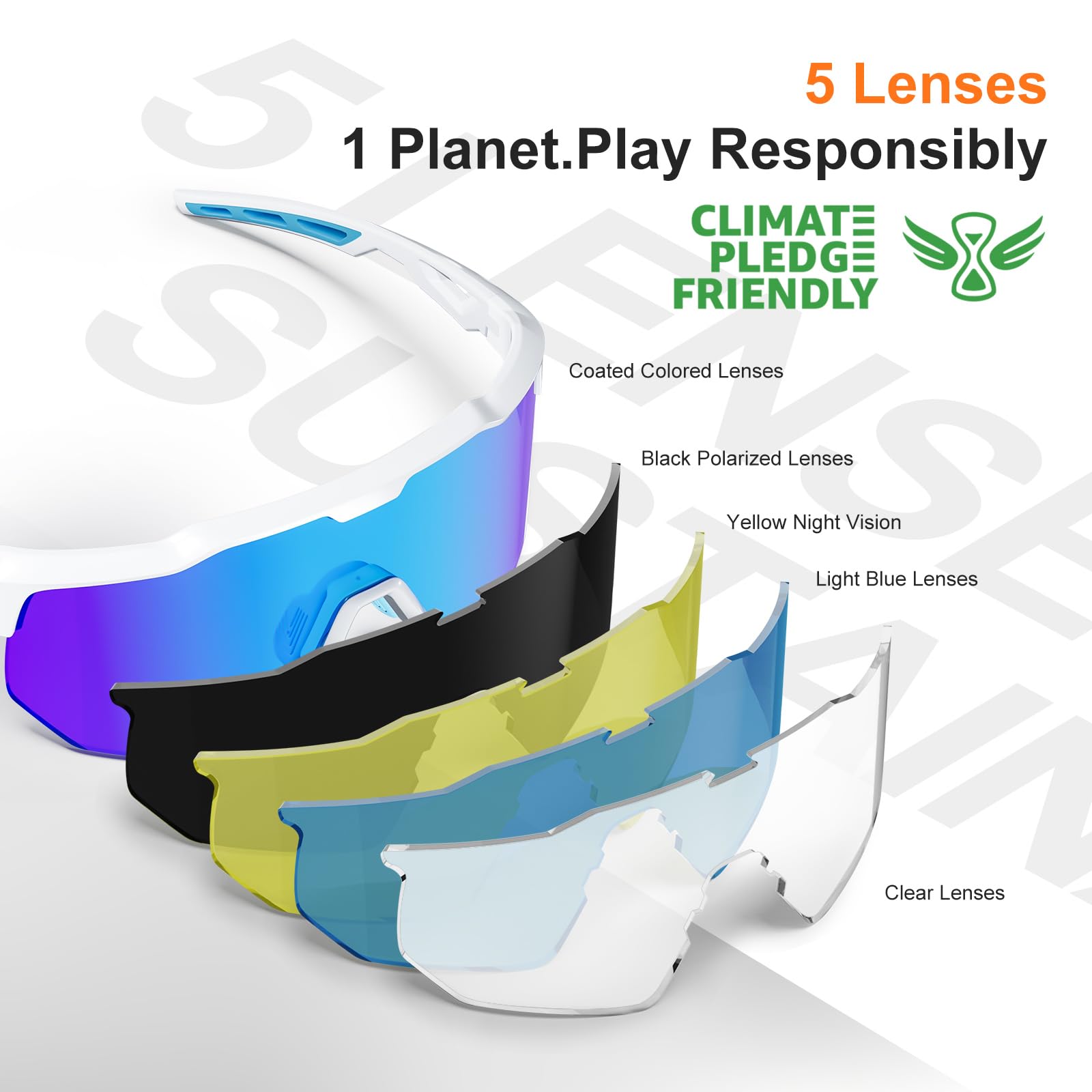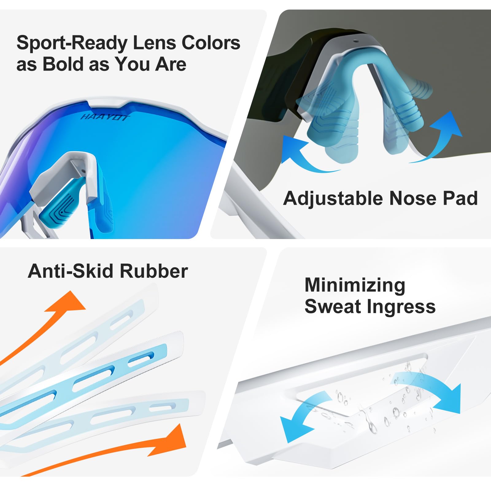 HAAYOT Polarized Cycling Glasses,Sports Sunglasses for Men Women,Baseball Biking Running Sunglasses 5 Lenses White Blue