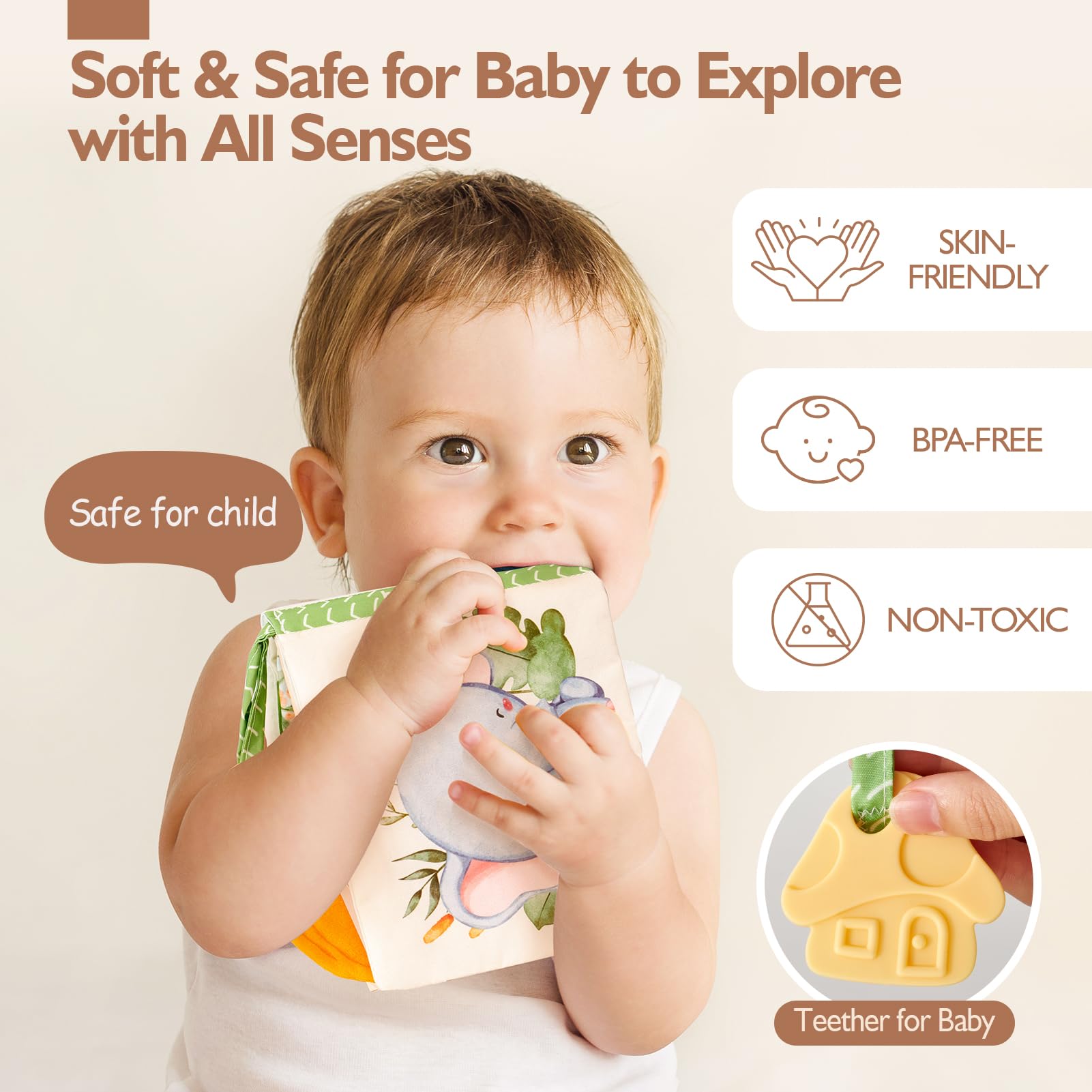 • All for Baby's Safe: The baby book is made from BPA-free cloth and is soft to touch and chew, easy to use by baby without getting hurt. No small or loose parts to avoid choking hazards and the stitching is strong enough to withstand chewing. Baby will play with the soft books in different ways as they grow. The first beginning is to touch and feel them. Once start teething, babies play by bringing books to their mouth, safely exploring these baby toys, help soothe gums
