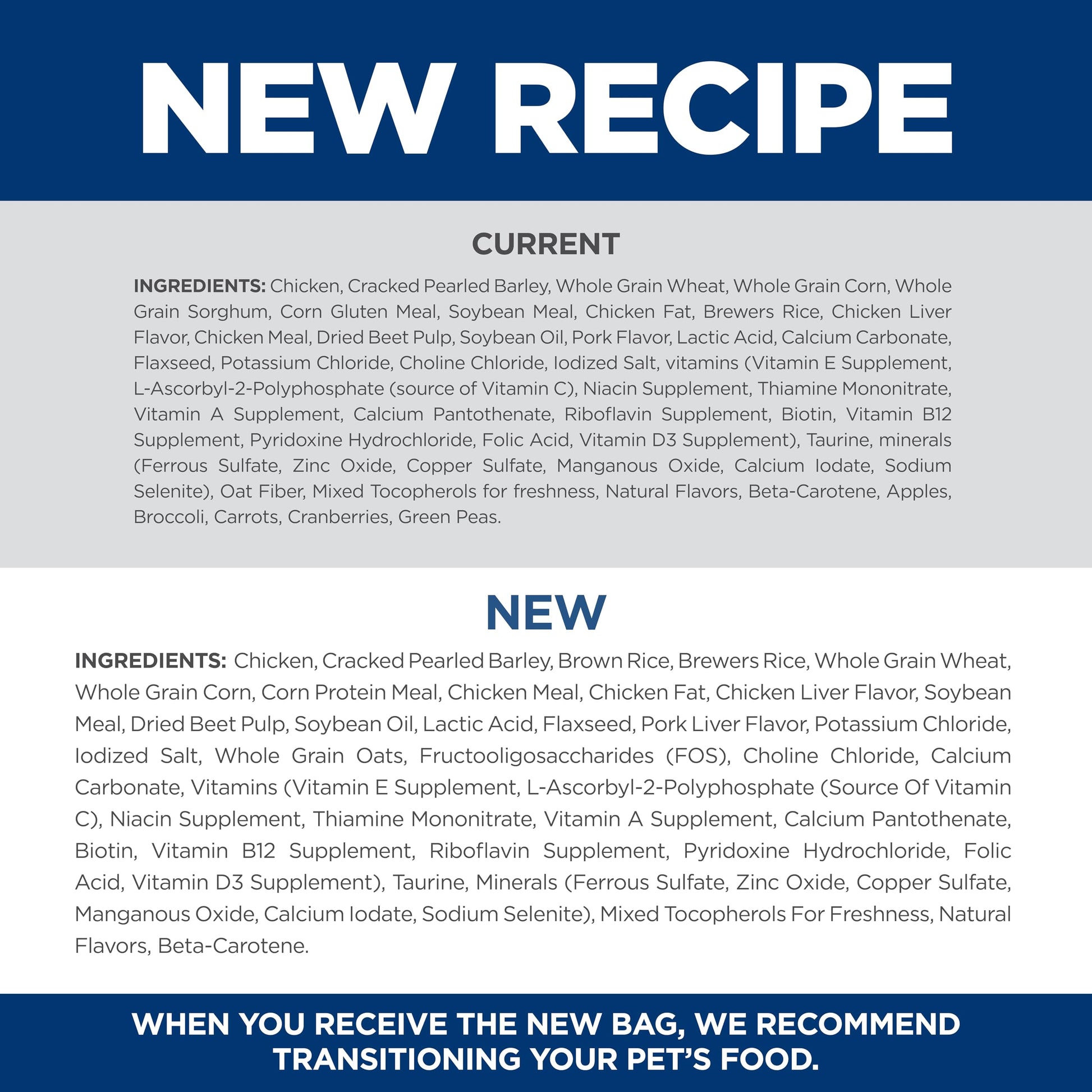 Details: When dogs are in the prime of their life, they'll need a premium pet food that can keep up. Hill's Science Diet Adult dry dog food uses a high quality protein source for lean muscles, natural fibers for healthy digestion and omega-6s for a beautiful coat. Specially formulated to make grown dogs come running for mealtime, this adult food provides the right balance of nutrients to help dogs live a happy, healthy life. Now there is even more to love with a special blend of prebiotic fibers and antioxidants, ActivBiome+ Multi-Benefit, to support digestion, immune system and organ health.