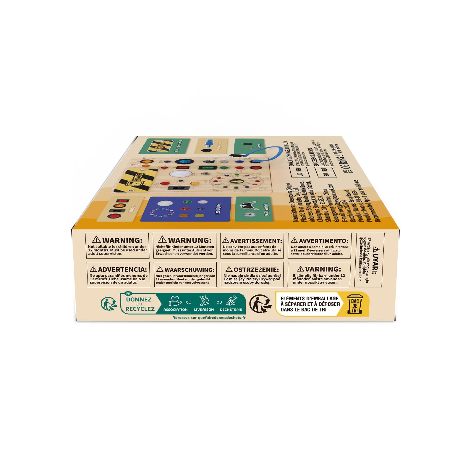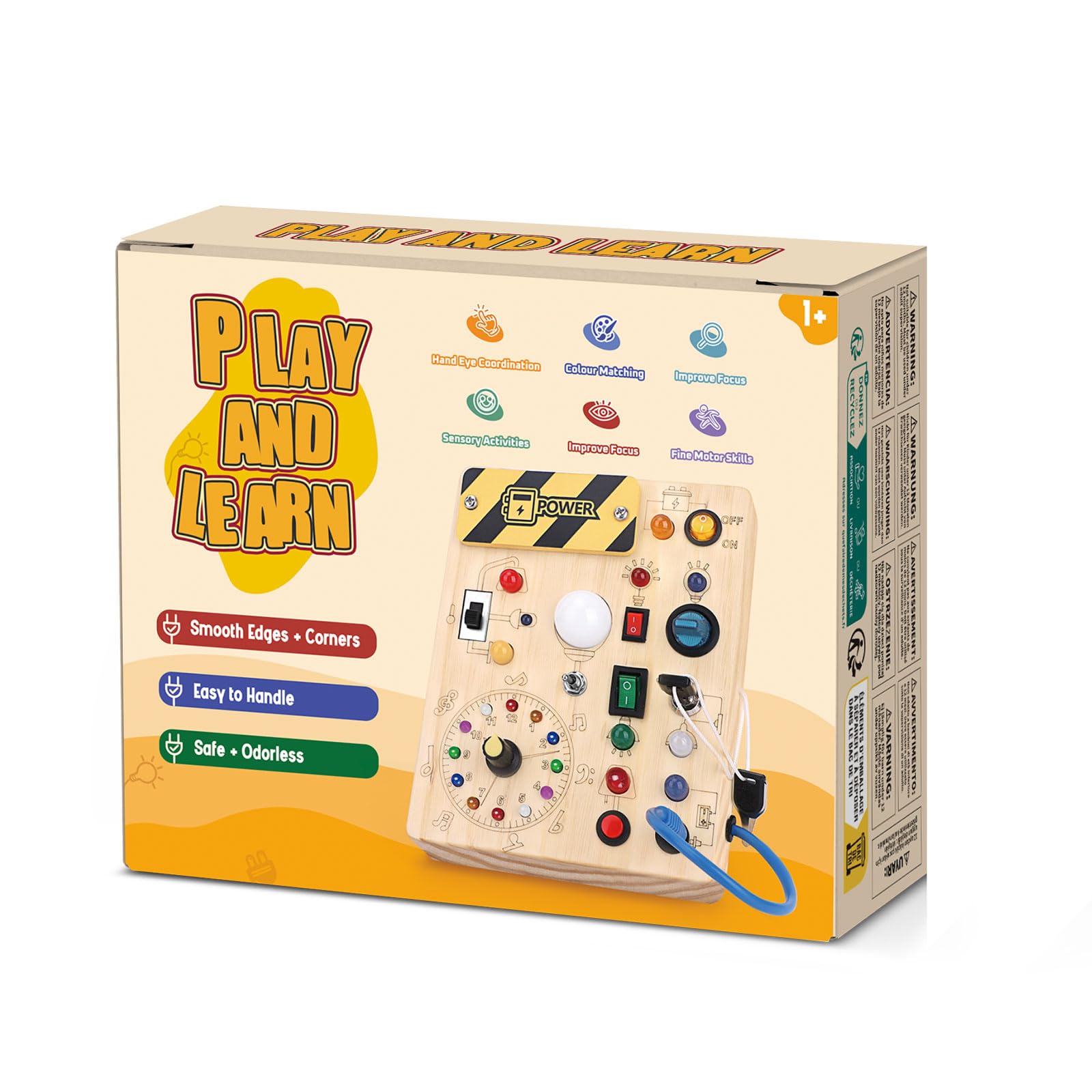 • Elaborate Design - This busy board is made especially for young children who like playing with switches and LED lights. On this busy board, there are 10 separate switches, and each switch relates to a different color or style of LED light. Each LED's brightness is set to be just right for the infant-not too bright, blinding, or dark to see well.A master switch is set up to turn off all LED lights with one click to avoid wasting power.