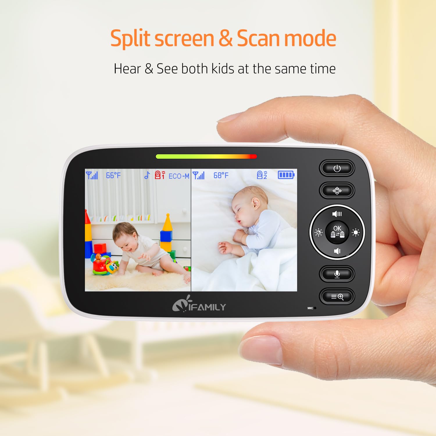 • Hear & See both baby at same time- Turn on the Split display and scan mode, you can just hear and see your both kids at the same time. With the ECO mode, you can even enjoy your peace of mind, the monitor will just wake you up when your baby make a noise.