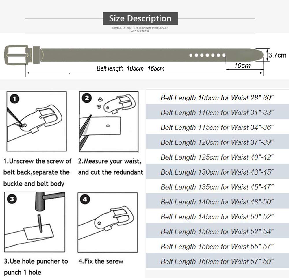 Belt Buckle: Fashion Classic Style, Simple and Generous Design, Workmanship, Antioxidation, According to the Arc Design of the Body; 2. Belt; High Quality Cow Leather, Workmanship, Beautiful, Multi Size, 100cm to 165cm Belt Length Usually Long Enough for Everyone! Packing list: 1 x gift bag, 1 x punch, 1 x belt, 1 x belt manual