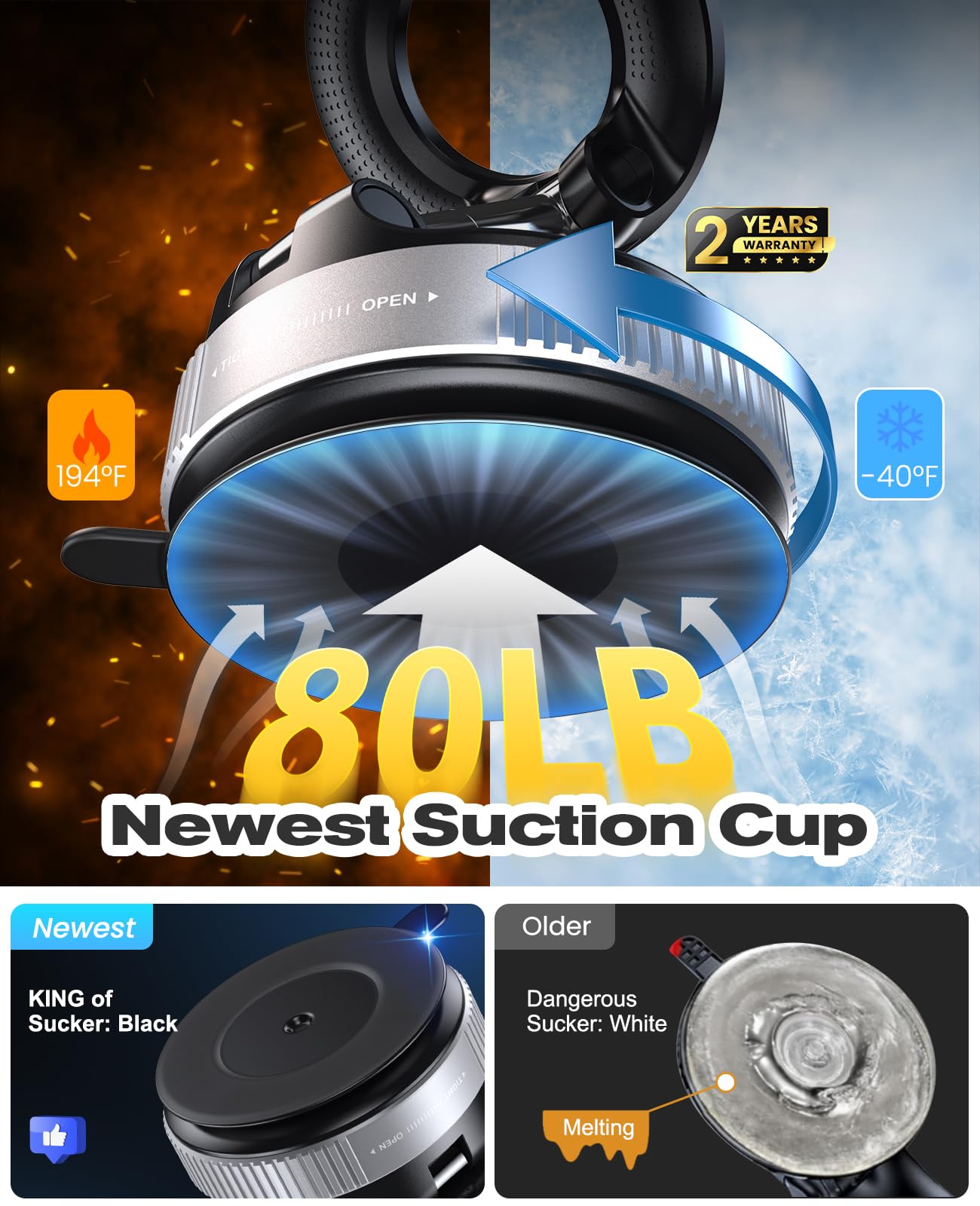 • Strong Suction & Stable Hold: This car phone mount uses advanced rotating-lock vacuum suction, boosting suction by 50% compared to traditional press-on mounts. It stays stable on bumpy roads or during sudden stops. The powerful vacuum cup supports up to 80lbs and holds firm in extreme temperatures (-40°F to 300°F). After 9999+ durability tests and 200+ reattachments, it can be cleaned and regain 99% of its suction power for lasting stability.