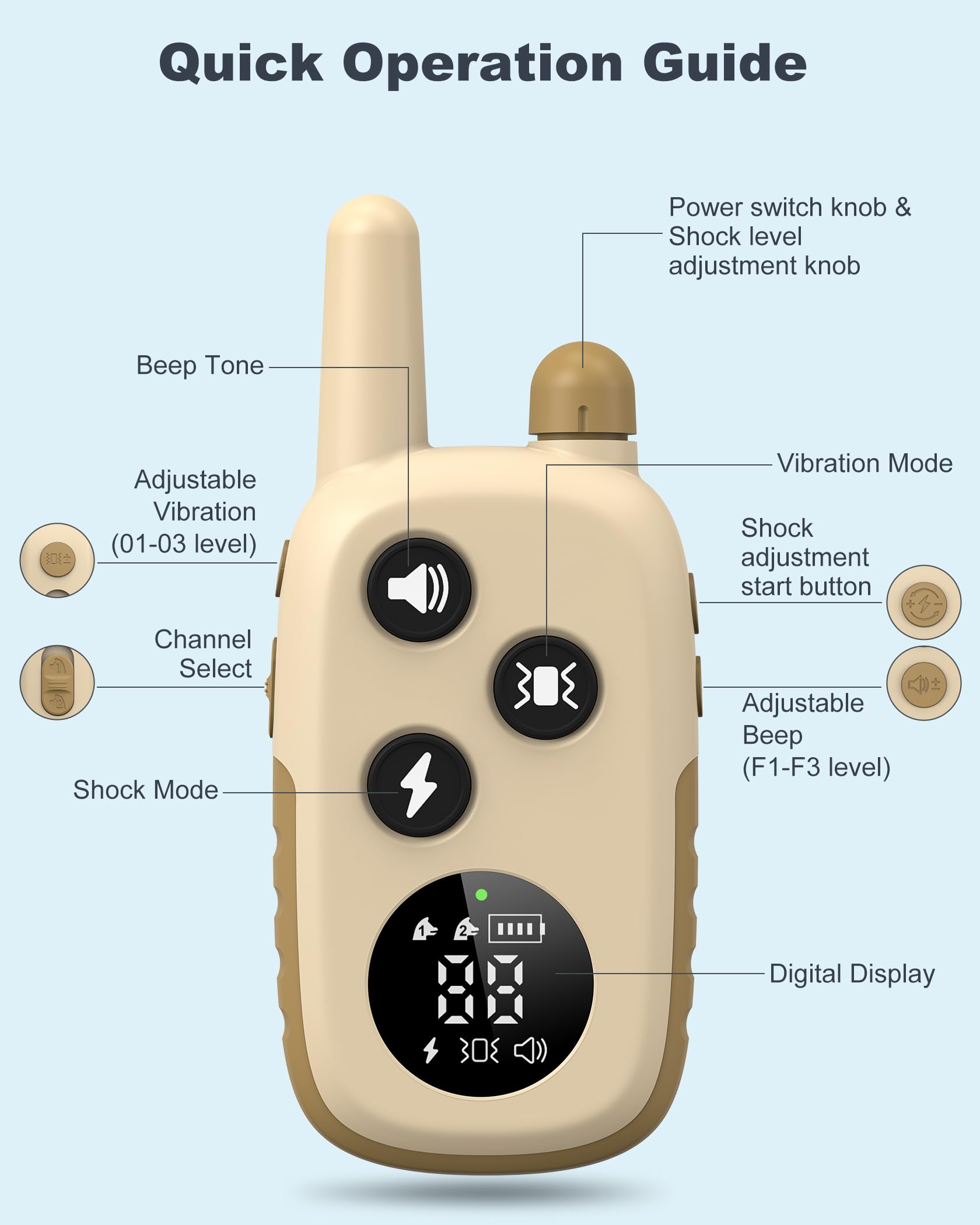 • 【Extended 4200FT Range & 2 Channel】The dog training collar covers up to 4200FT providing a stronger and more stable signal, ensuring you can enjoy training time with your dog in the backyard, park, beach or anywhere else. With dual-channel, one remote supports 2 receiver collars, and you can train 2 dogs at the same time! Besides, it has a memory function without resetting it.