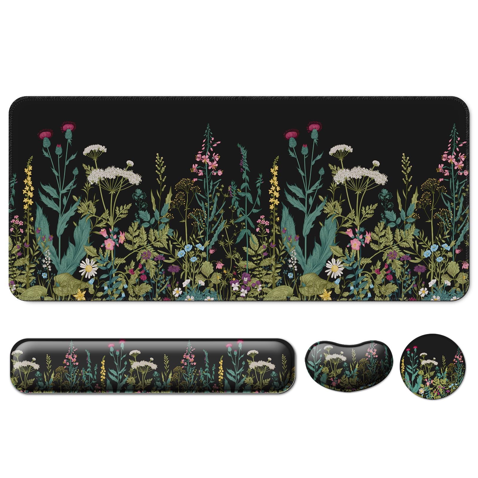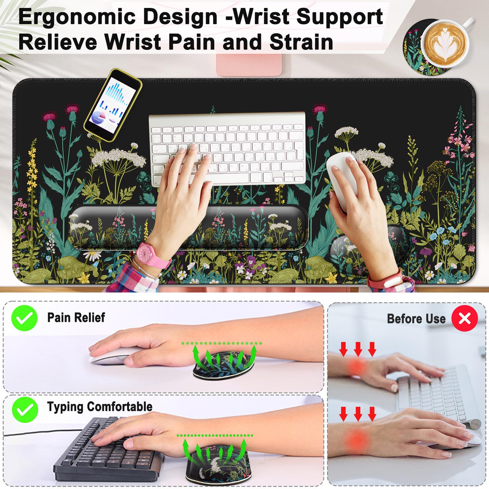 Keyboard Wrist Rest + Mouse Pad with Wrist Support + Desk Mat + Coaster 4 in 1 Set, XXL Large Gaming Mousepad Cute Ergonomic Mouse Pads for Desk Computer Laptop Office Decor-Little Flowers