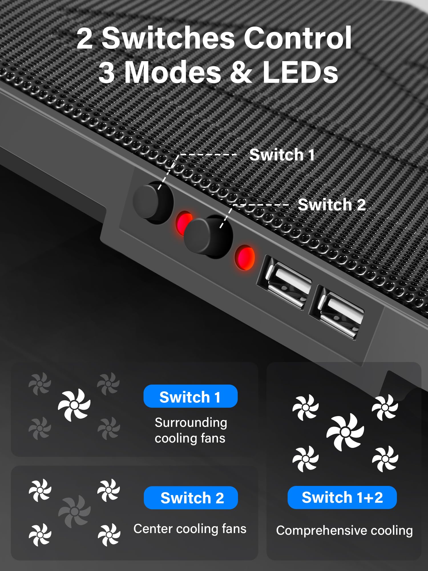 • Enhanced Cooling Performance: The laptop cooling pad features 5 built-in fans (big fan: 4.72-inch, small fans: 2.76-inch), all with red LEDs. 2 On/Off switches enable simultaneous control of all 5 fans and LEDs. Simply press the switch to select 1 fan working, 4 fans working, or all 5 working together.