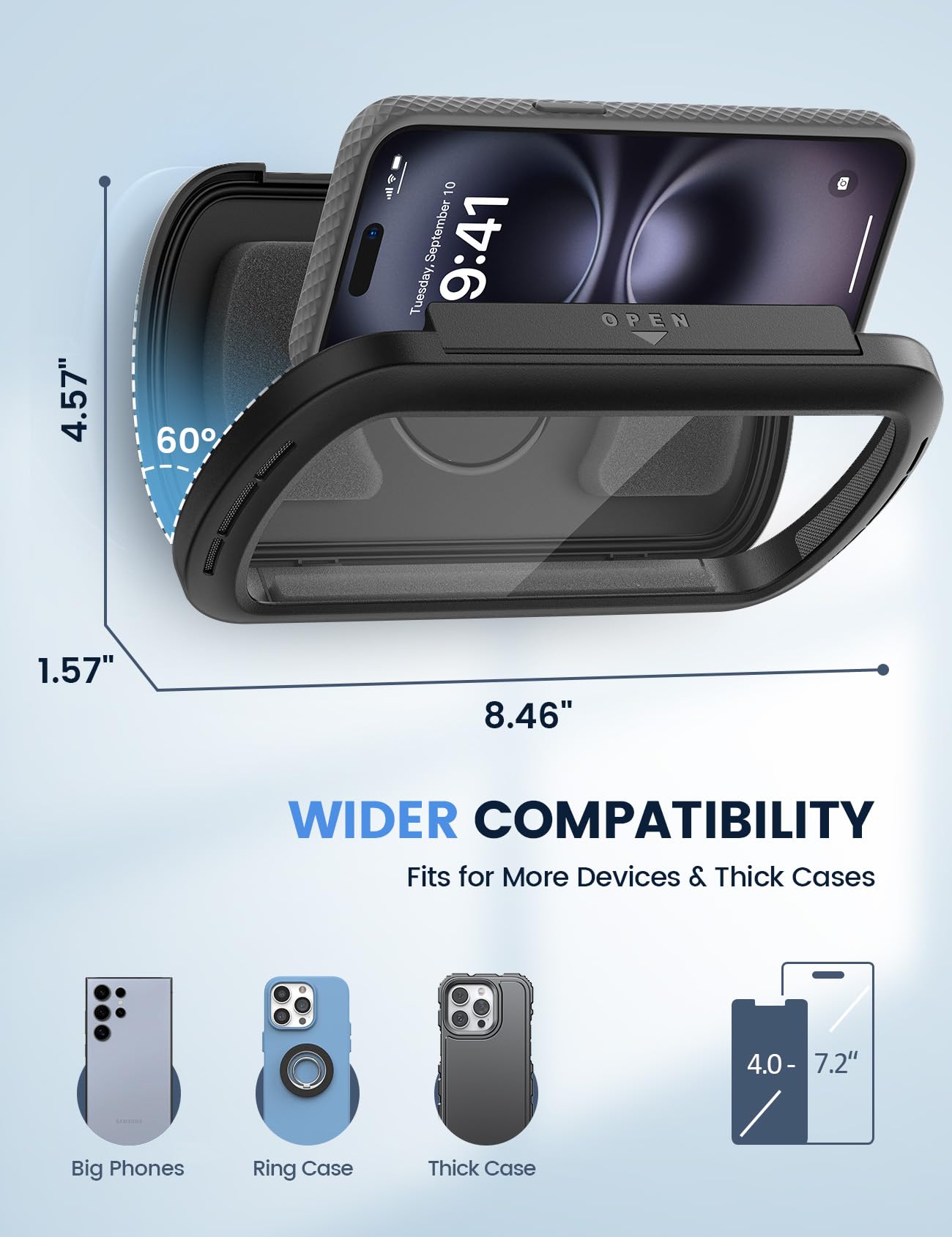 • 【2-Min Drill-Free Installaion】Coming with 3 pcs industrial strong adhesive wall hooks, supporting the weight up to 4.5 lbs. With drill-free design, you can freely choose different mounted positions and use this wall phone case stand for mirror, bathroom, bathtub, kitchen, shower, pool, etc. (Notice: Please make sure the wall stay dry before installation and leave for 24 hours before use)
