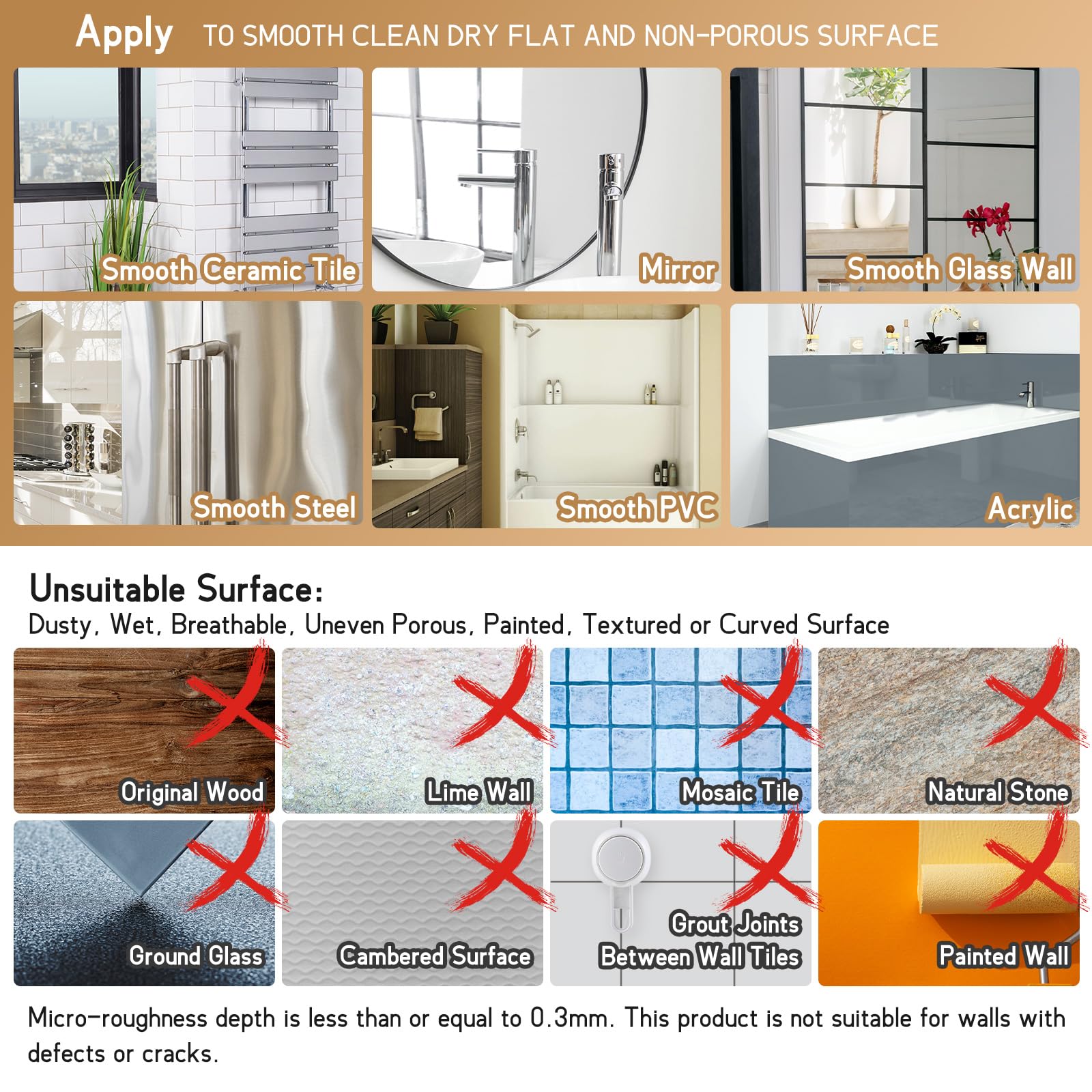 • Warm tips: This wall mounted toothbrush holder works best for non-porous, impervious, smooth surfaces such as glass, mirror, polished metal, stainless steel, plastic board, wall tile, grainy granite even with a little bit of dimpling, etc. Don't stick to a grout line and on the porous surfaces such as wood, unfinished marble, porcelain, wallpaper, natural stones, painted wall, etc.