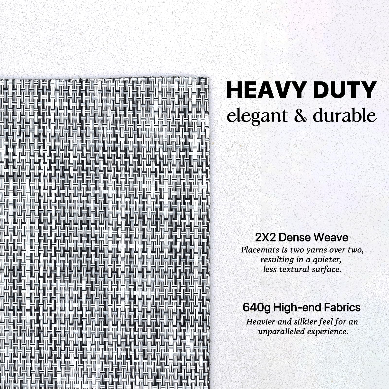 • HEAVY-DUTY:We uses the German-imported higher grammage vinyl material (Specialty PVC)than other placemats on the market,plus the precise,dense weave craftsmanship to give the woven placemats a thicker feel and make the place mats long-lasting.